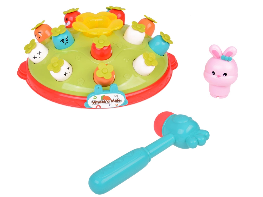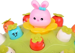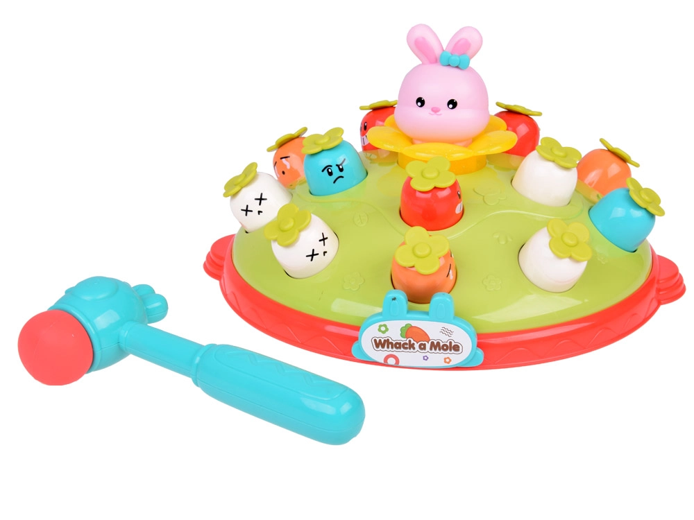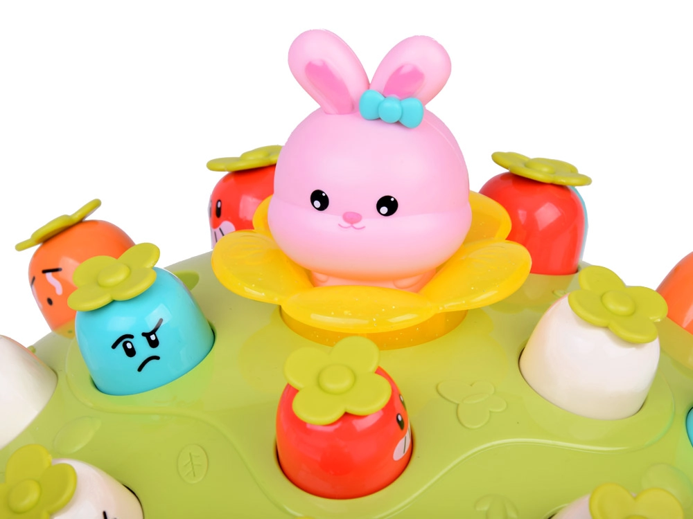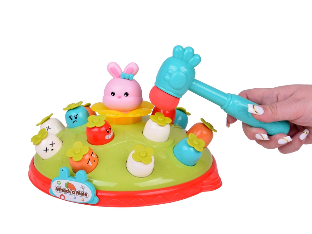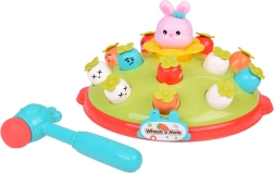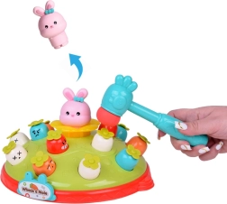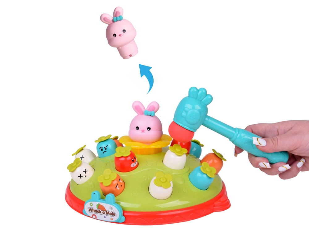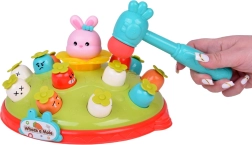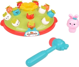 Izklaide ir ne tikai vizuāla un audiāla, bet arī motoriska. Bērns var vērot, kā viņa sitieni ar āmuriņu ietekmē atsevišķo figūriņu uzvedību. Pieejams drošs āmuriņš ar mīkstu galu. Pēc spēles āmuriņu var ievietot paredzētajā atverē blakus burkāniem.