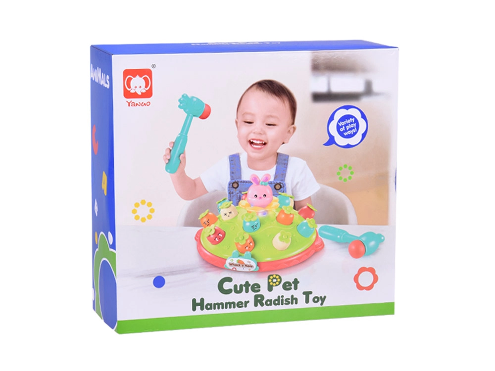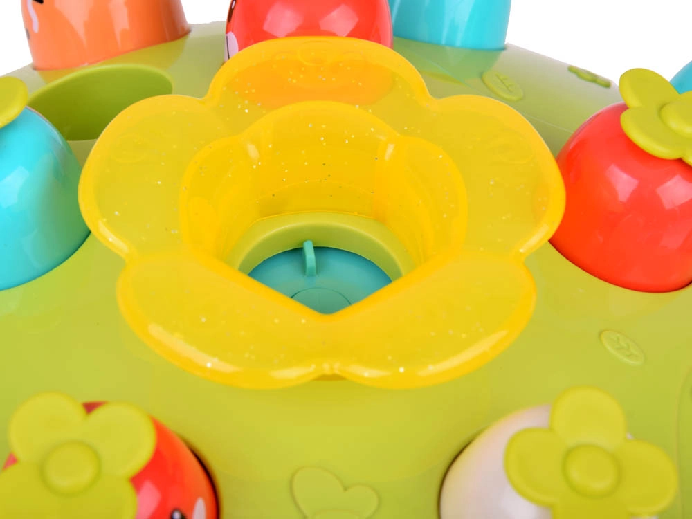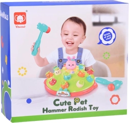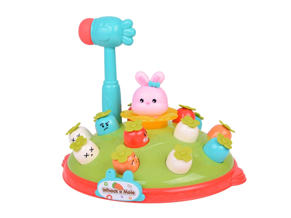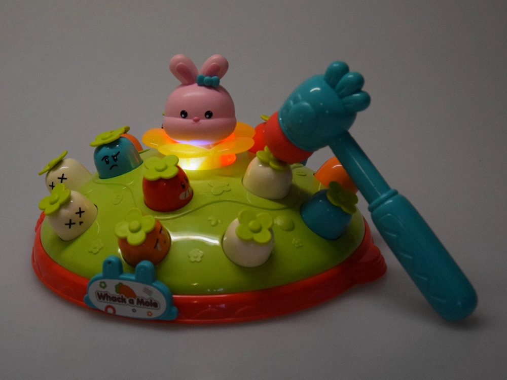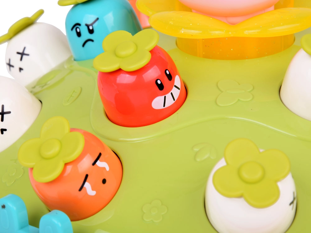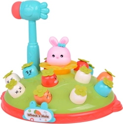 Izklaide ir ne tikai vizuāla un audiāla, bet arī motoriska. Bērns var vērot, kā viņa sitieni ar āmuriņu ietekmē atsevišķo figūriņu uzvedību. Pieejams drošs āmuriņš ar mīkstu galu. Pēc spēles āmuriņu var ievietot paredzētajā atverē blakus burkāniem.