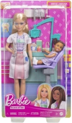 Spēlējiet zobārstu ar Barbiju un viņas pacientu. Komplektā ir balts halāts, zobārstniecības instrumenti un zobārsta krēsls.