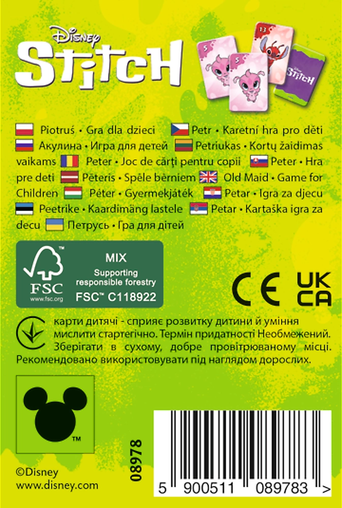 Izbaudiet tradicionālo kāršu spēli Melnā Pētera ar iemīļoto Trefl zīmola Stitch motīvu, kas gadu desmitiem sagādā prieku bērniem un pieaugušajiem. Brīnišķīga izklaide visai ģimenei!