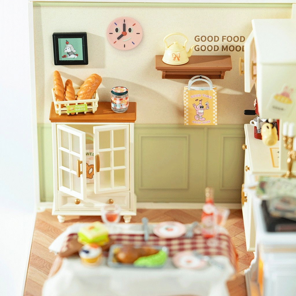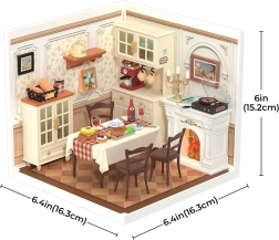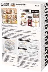 Izveidojiet savu miniatūro ēdamistabu siltos krēmkrāsas toņos ar plašu galdu, servīzes skapi un daudziem autentiskiem aksesuāriem – no maizītēm, šķīvjiem un krūzītēm līdz pat kafijas aparātam, svečturim un gramofonam. Reālistiskās detaļas un LED apgaismojums rada mājīgu noskaņu un piešķir modelim īpašu šarmu.