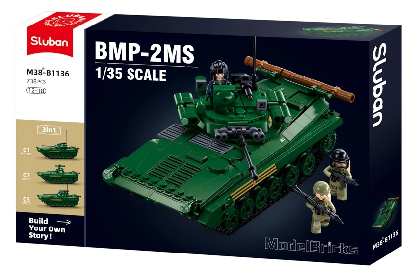 Sluban komplektā ir 738 detaļas, ar kurām varat izveidot dažādus modeļus, un tas ir piemērots bērniem no 12 gadu vecuma. Trīs iekļautajām minifigurām ir rotējošas un šūpojamas daļas, kas ļauj veidot reālistiskas kaujas ainas. Saderība ar iecienītajiem zīmoliem, piemēram, Lego, Cobi vai Mega Bloks, sniedz ievērojami plašākas būvēšanas iespējas.
