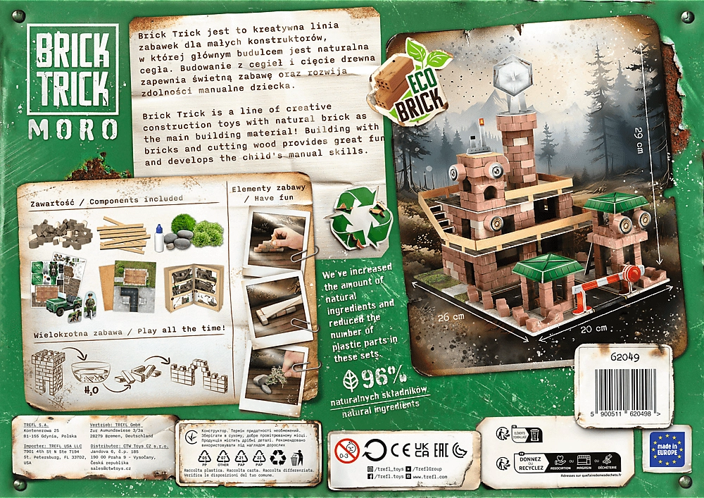 Savienojot vairākus TREFL Brick Trick komplektus, ir iespējams izveidot gleznainu ciematiņu, modernu pilsētu vai viduslaiku apmetni. Ar ūdenī šķīstošu līmi komplektu var izmantot atkārtoti.