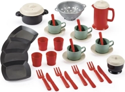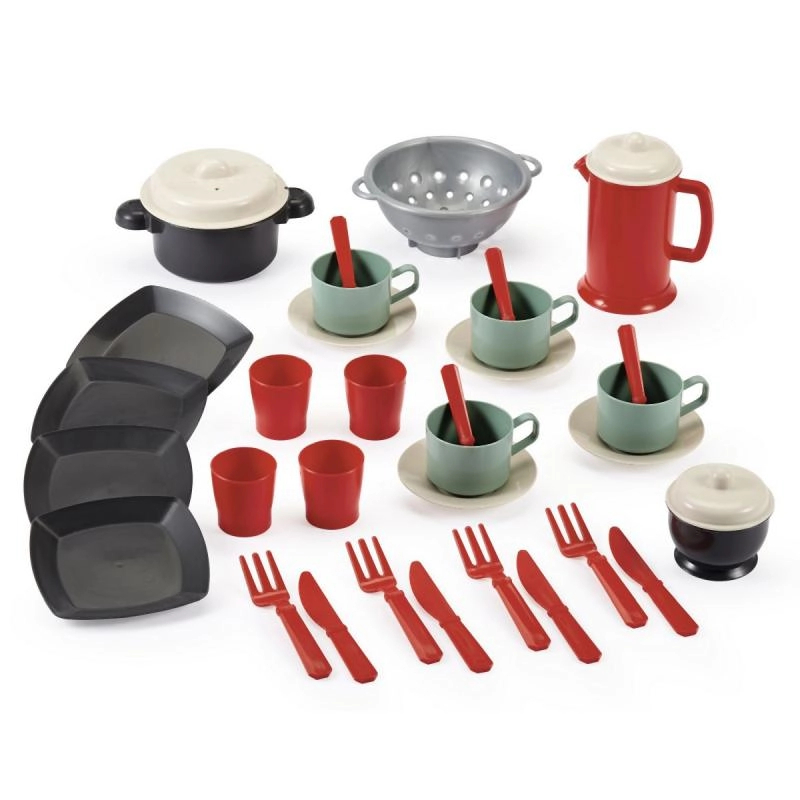 Liela caurspīdīga soma ar četrām šķīvju komplektācijām, galda piederumiem, glāzītēm, krūzītēm ar apakštasītēm, kanniņu, cukurtrauku, sietiņu un katlu ar vāku. Lielisks bērnu komplekts aizraujošām rotaļām.