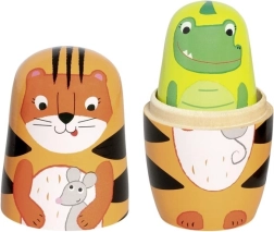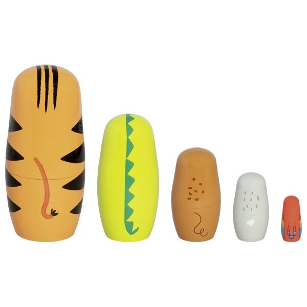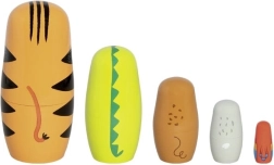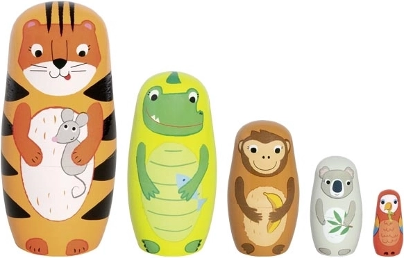 Šis oriģinālais 5 koka matrjošku komplekts eksotisku dzīvnieku veidolā (tīģeris, krokodils, mērkaķītis, koala un putniņš) bērniem sniedz prieku par izmēru atklāšanu un jautrību salikšanā. Katra figūriņa ir rūpīgi apgleznota, patīkama rokās un, pateicoties gludajai virsmai, viegli atverama un aizverama.