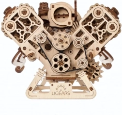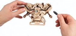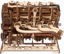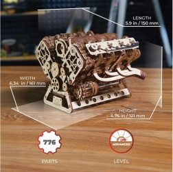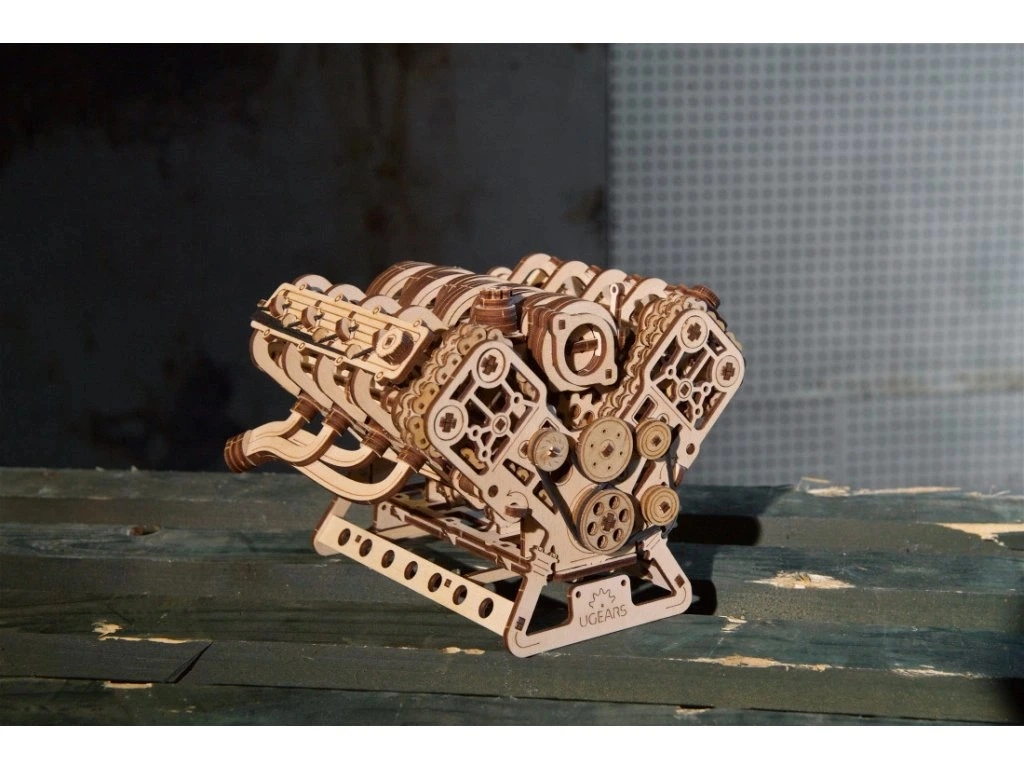 Koka mehāniskais V8 motora modelis uzticami atdarina īsta astoņcilindru darba ciklu: astoņi cilindri ar ritmisku virzuļu gaitu, 16 vārsti, ko vada sadales vārpstas, sadales piedziņa ar regulējamu ķēdi (32 posmi) un agregāti, ko darbina rievots piedziņas siksnas mehānisms. Pateicoties barošanai caur USB‑C vai manuālai griešanai, varat izbaudīt reālistiskas mehāniskas kustības un labāk izprast iekšdedzes dzinēja principus.