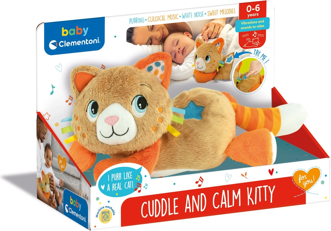 Šī īpaši maiga plīša kaķenīte no CLEMENTONI BABY ir veidota, lai sniegtu bērniem mierinājumu un palīdzētu aizmigt. Vibrācijas reālistiski atdarina kaķa murrāšanu, veicinot relaksāciju, savukārt nomierinošu skaņu izvēle (klasiskā mūzika, baltais troksnis un saldas melodijas) rada patīkamu atmosfēru miegam.