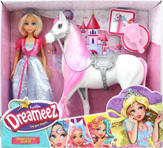 Atklājiet burvīgo komplektu princese ar zirdziņu no DREAMEEZ – lelle apmēram 29 cm augstumā skaistā kleitā ar kroni un mīļu zirdziņu ar krēpēm. Ideāli piemērots pasaku spēlēm, iztēles attīstībai un sīkās motorikas trenēšanai, ķemmējot un kopjot krēpes.