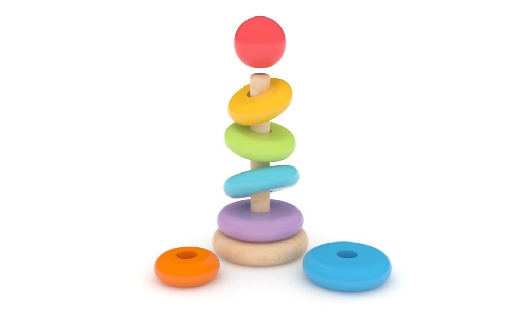 - Sīkā motorika un koordinācija – gredzenu uzvilkšana trenē satvērienu un precizitāti.