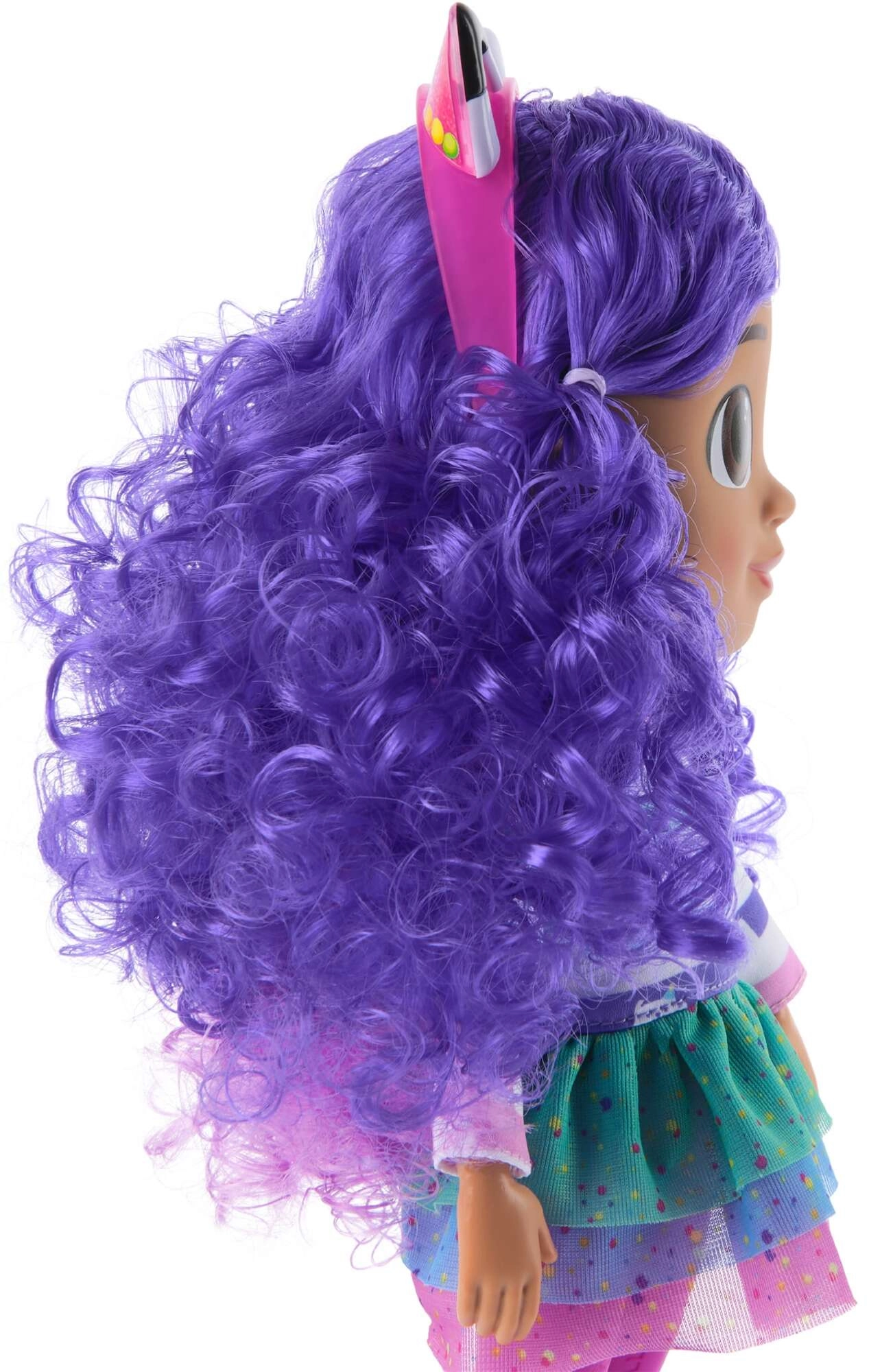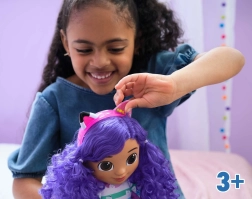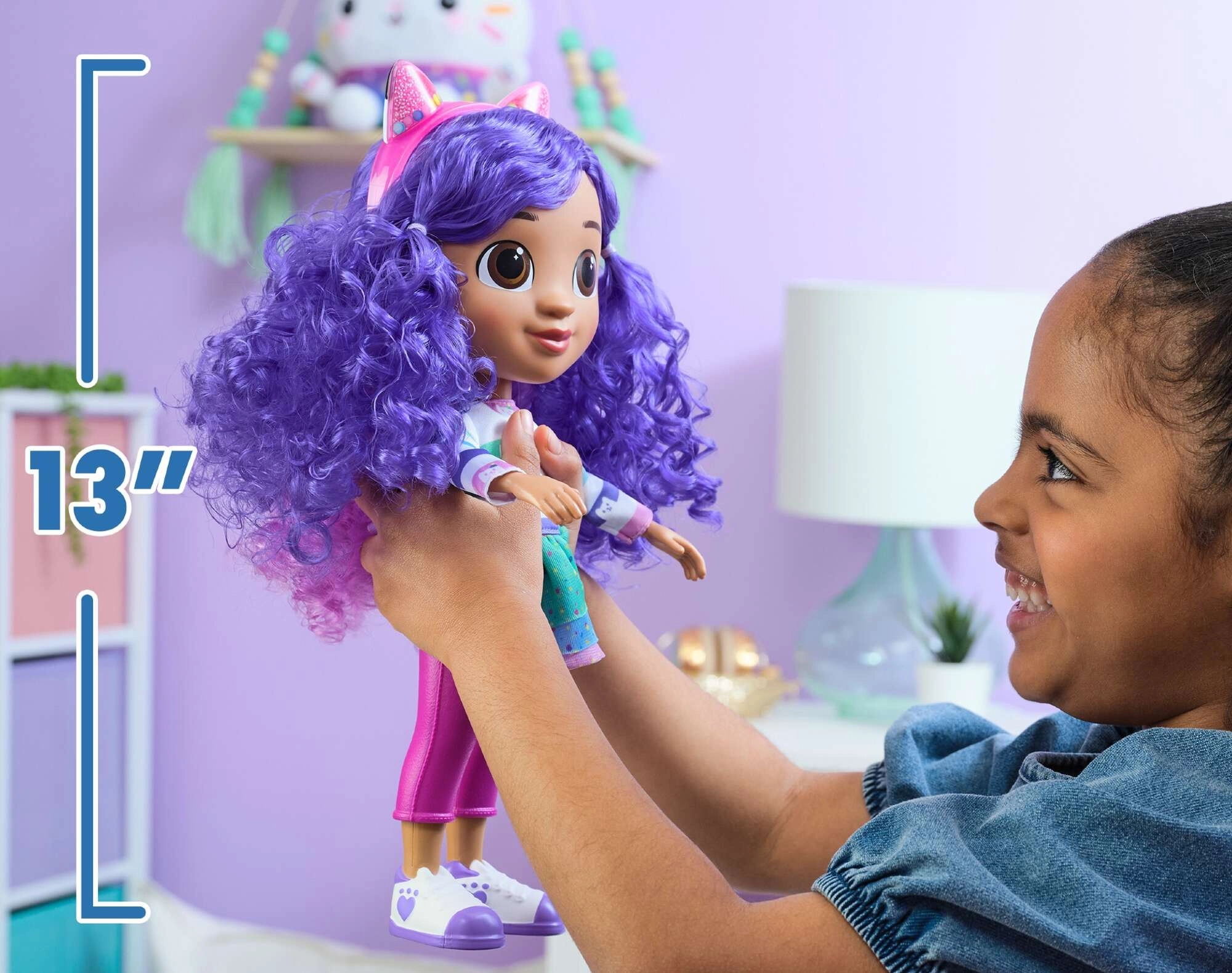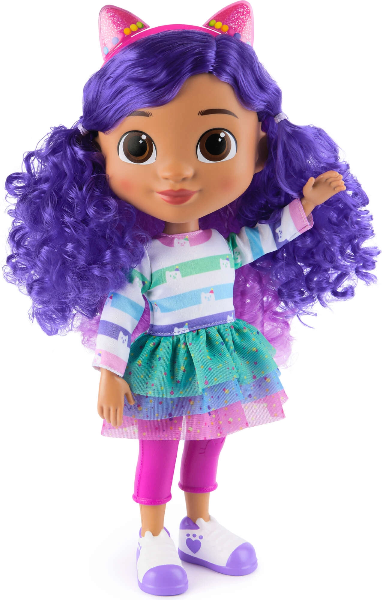 Lelle Gabby ienes bērnu istabā iemīļoto Netflix hīta noskaņu. Skaisti violeti, cirtaini mati, ballītes tērps un kaķu stīpiņa ar rotējošām austiņām rosina iztēli un stilizēšanu. Pateicoties locītavām, to var viegli nostādīt, sēdināt un iekārtot jautrās pozās.