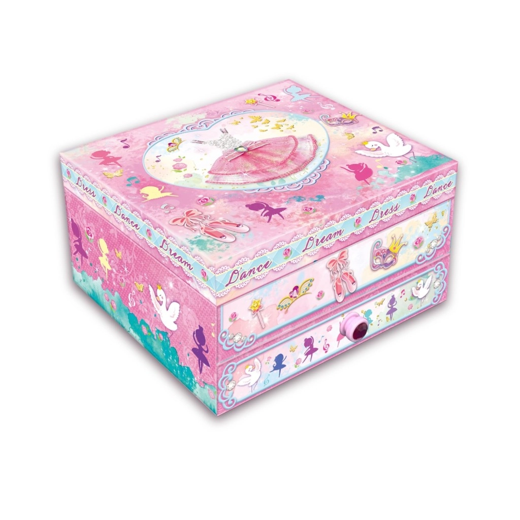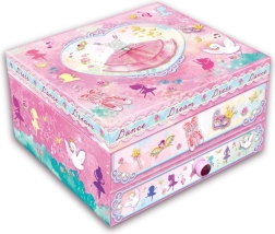 Šī valdzinājuma pilnā rotu lādīte ar balerīnu ir lieliska vieta sīku rotu, gumiju, sprādžu un citu dārgumu glabāšanai. Pēc mehānisma uzvilkšanas un vāka atvēršanas balerīna sāk griezties patīkamas melodijas pavadībā, radot burvīgu noskaņu.