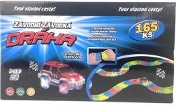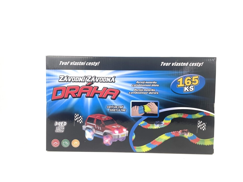 Komplektā ir iekļauta arī mašīnīte ar LED apgaismojumu (9,5 × 5,5 cm), kas piešķir spēlei dinamiku un aizrautību. Trase un mašīnīte tumsā iedegas, nodrošinot neticamu vizuālo baudījumu.
