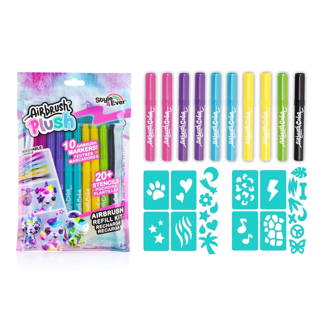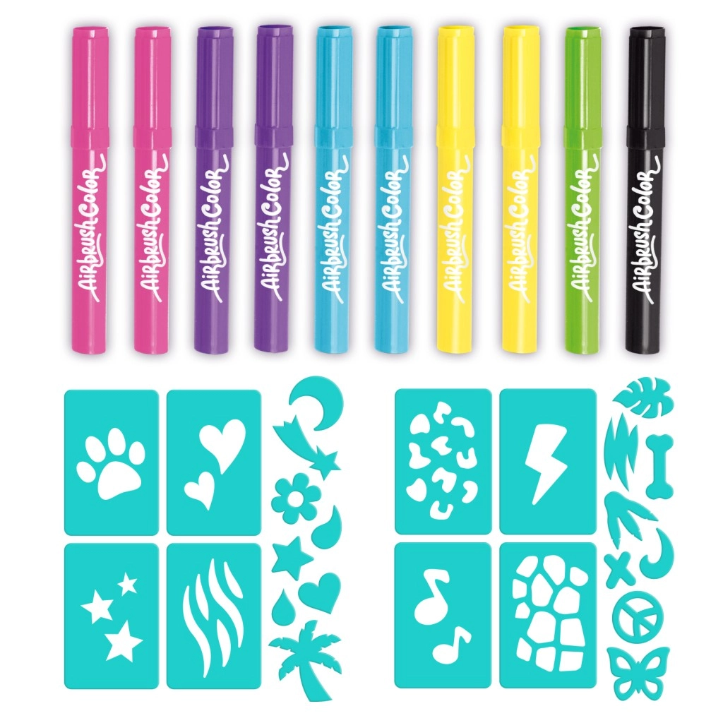 Rezerves krāsainas airbruša uzpildes, ideālas mazajiem radošajiem! Iekļauj 10 spilgtas krāsas un 20 dažādas šablonas, kas iedvesmos bērnu iztēli.
