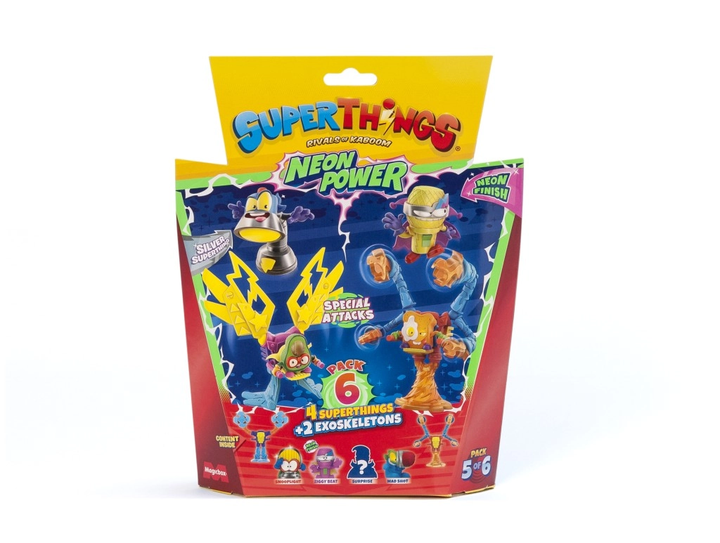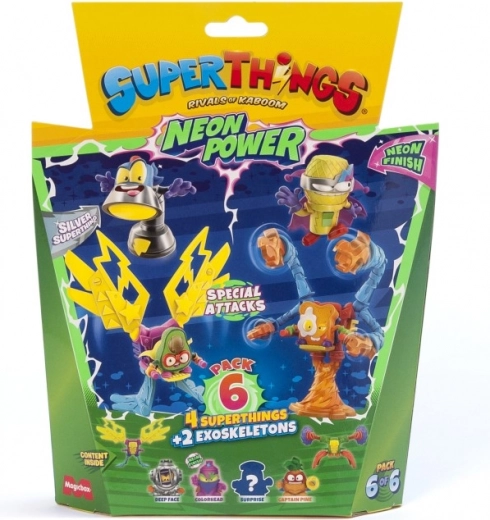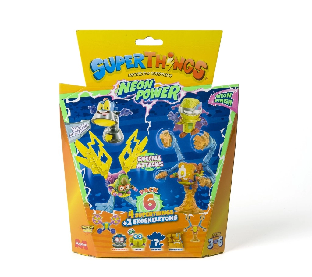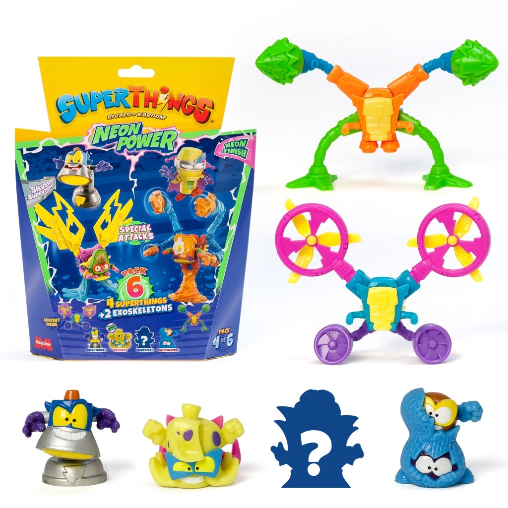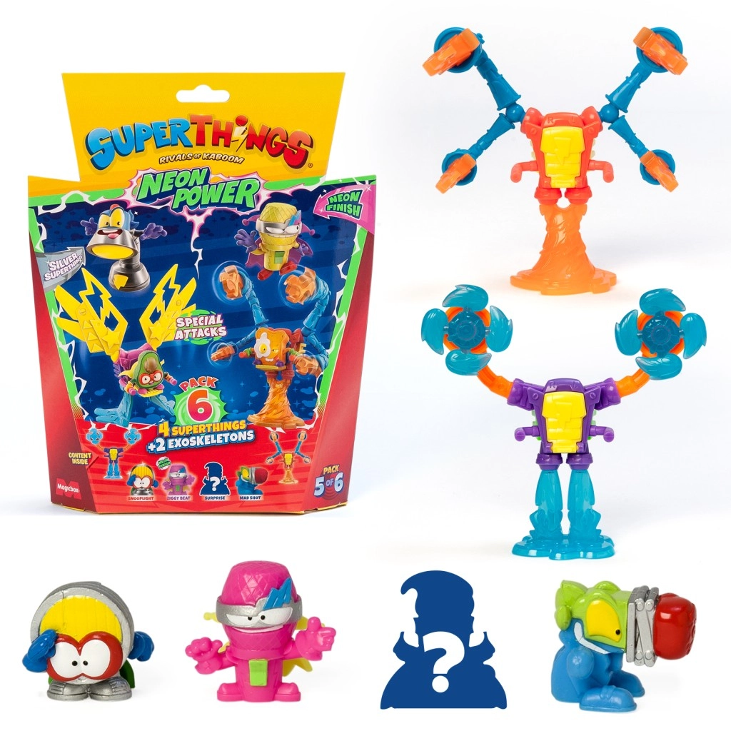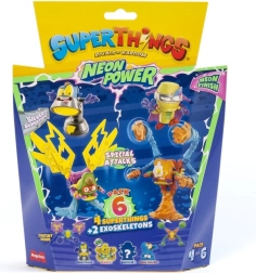 Ienāciet Kaboom pilsētā un papildiniet savu kolekciju ar SuperThings: Neon Power! Katrs iepakojums piedāvā 4 varoņu (vai neliešu) figūriņu un 2 eksoskeletu kombināciju, kas piešķir jūsu cīņām spēku un stilu. Neona noformējums garantē, ka jūsu tēli izcelsies jebkurā akcijā.