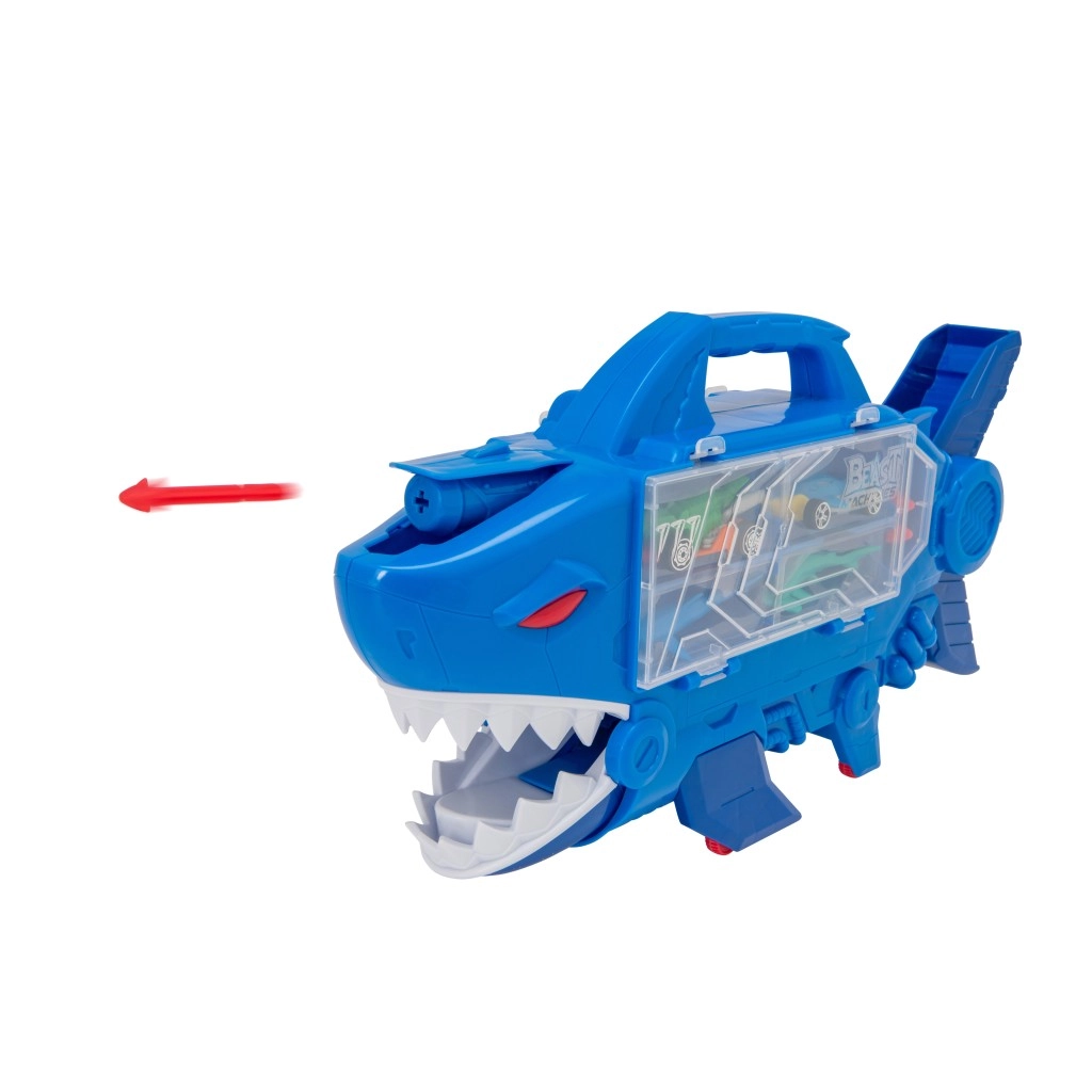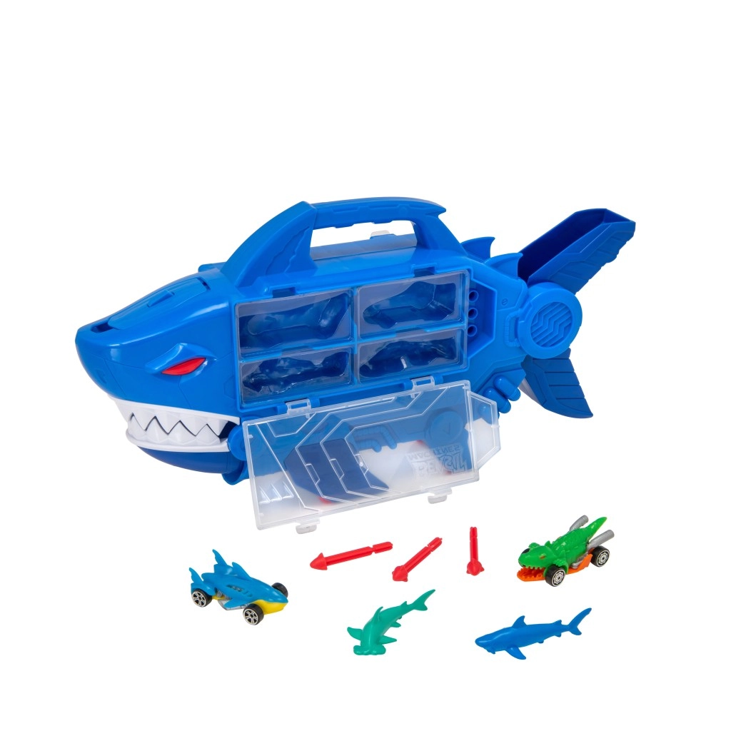 Izbaudi dinamisku braucienu ar TEAMSTERZ haizivs transportlīdzekli! Šis oriģinālais pārvadātājs un garāža vienā ietilpina līdz 8 metāla mašīnītēm, ir aprīkots ar nolokāmu iekšējo rampu, brīvi ripojošiem riteņiem un ērtu rokturi. Nospied pogu un izšauj raķetes no haizivs galvas, izbrauc cauri haizivs žokļiem un izbaudi ātro trasi. Lieliska rotaļlieta smalkās motorikas un iztēles attīstīšanai, piemērota no 3 gadu vecuma.