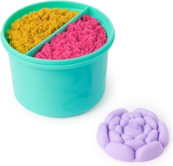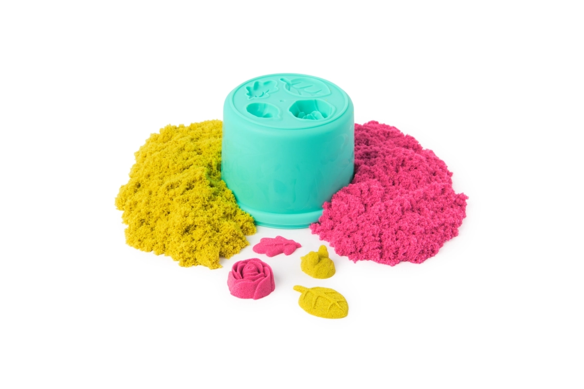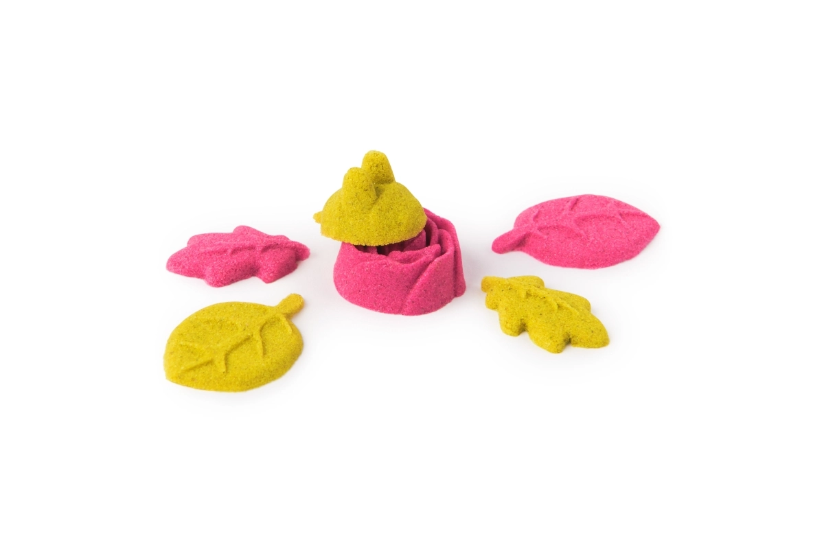 - 240 g kinētisko smilšu (neona rozā un dzeltenas), puķupods ar mīkstu pamatni, augšējā zieda forma, formiņas rozēm, bitītēm un lapām