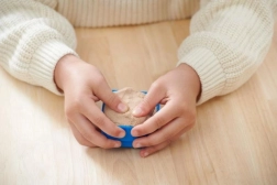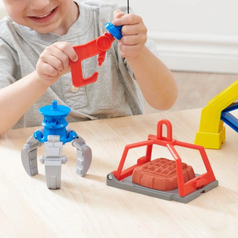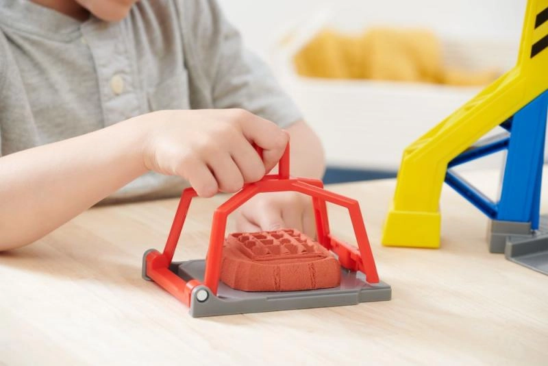 Ļauj bērniem veidot savus būvniecības blokus, izmantojot kinetiskās smiltis. Ar sarkano sviru darbināms preses mehānisms palīdz veidot un pēc tam apstrādāt pašu radītās konstrukcijas.