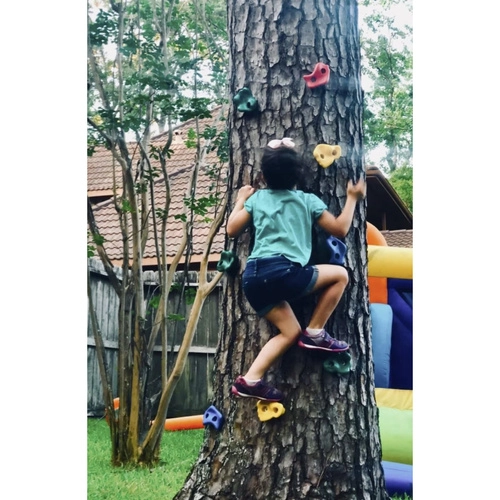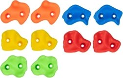 Izveidojiet mājās vai dārzā drošu bērnu kāpšanas sienu dažu minūšu laikā. Krāsainie satvērieni no izturīga PP materiāla ir pretslīdes, UV izturīgi un noturīgi pret laikapstākļiem, ar vieglu montāžu izmantojot iekļauto stiprinājumu komplektu. Komplekts ar 10 satvērieniem un 2 izturīgiem rokturiem attīsta koordināciju, spēku un veiklību, kā arī veicina aktīvas kustības gan ārā, gan telpās.
