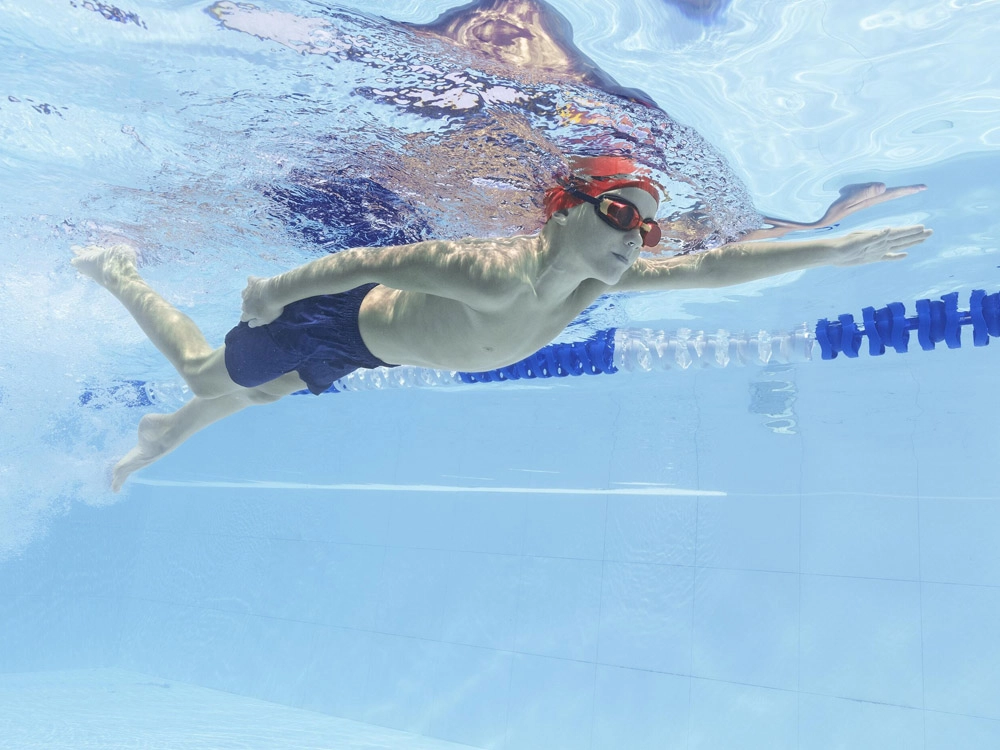Košais divtoņu dizains uzlabo bērna redzamību baseinā un piešķir stilu katrā treniņā.