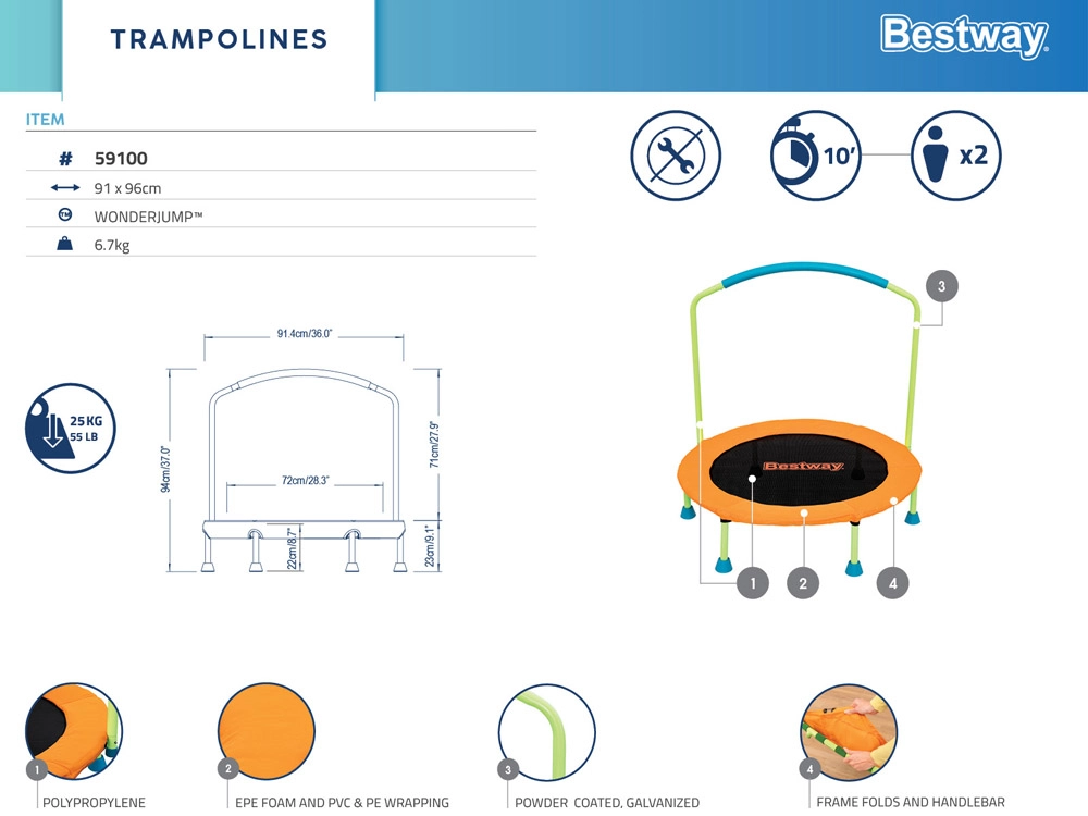 Bērnu batuts BESTWAY WonderJump piedāvā drošas kustības mājās un dārzā. Pateicoties stabilai metāla konstrukcijai, mīkstajam putu rokturim un pretbuksēšanas kājiņām, lēkāšana bērniem ir jautra un droša. Kompaktais, vieglu salikšanu nodrošinošais rāmis atvieglo pārnēsāšanu un glabāšanu.