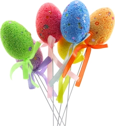 Izveidojiet košu pavasara noformējumu dažu mirkļu laikā. Komplektā iekļautas 6 dekoratīvas oliņas uz kātiņa dažādās krāsās, kas lieliski izceļas vāzē ar zariņiem, puķupodā vai pītās kompozīcijās. Viegls putuplasts ar virsmu, kas klāta ar bumbiņām un smalkiem rakstiem, vienlaikus šķiet rotaļīgs un elegants.