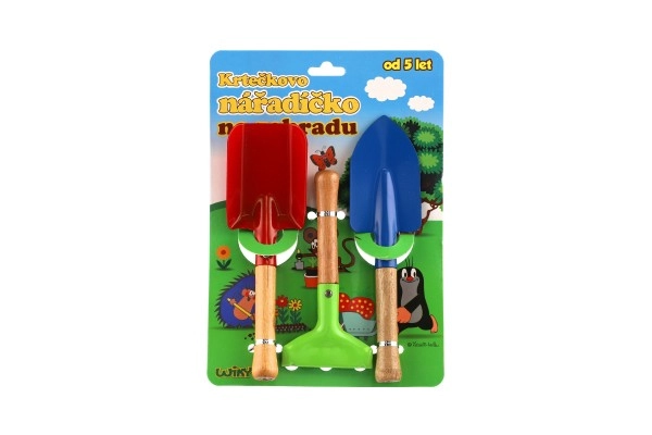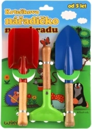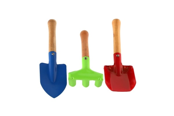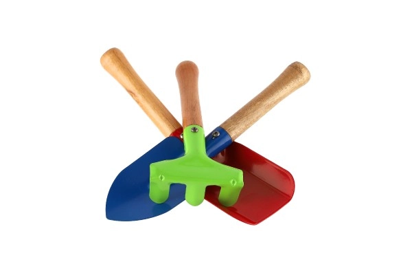 Trīs pamatinstrumenti – lāpstiņa, kaplis un grābeklis – ļauj bērniem rakt, pārstādīt un irdināt augsni. Viss ideālā izmērā bērna rokai.