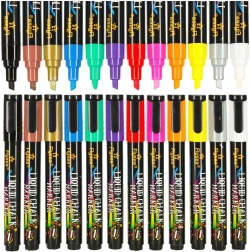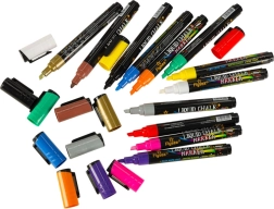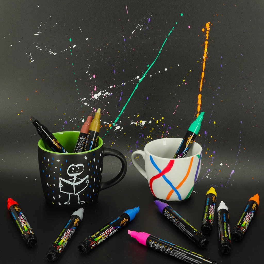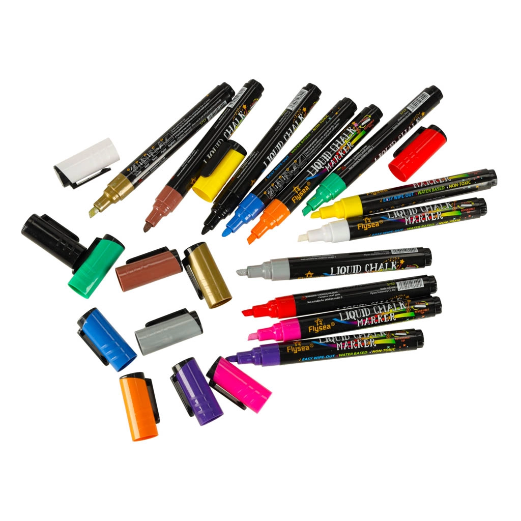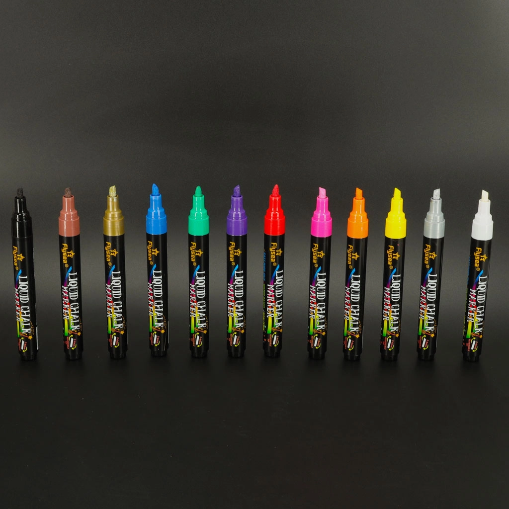 Iepakojumā atradīsiet 12 piesātinātus toņus, tostarp baltu, melnu, zelta un sudraba – lieliski izcelšanai un dekorēšanai. Marķieri ir bezputekļu, netoksiski un piemēroti atkārtotai lietošanai uz stikla, tāfelēm, skatlogiem, keramikas krūzēm un plastmasas virsmām.