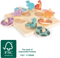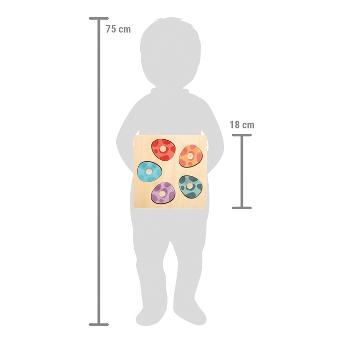 Šī izturīgā koka rotaļlieta spilgtās krāsās iepriecinās visus mazos dinozauru cienītājus. Zem sešām olām slēpjas seši koka dinozauri atbilstošās krāsās, tāpēc bērni var trenēt atmiņu un pāru saskaņošanu. Pateicoties ērtajiem pogveida rokturiem, spēle ir ideāla pirmajai iepazīšanai ar puzlēm.