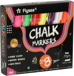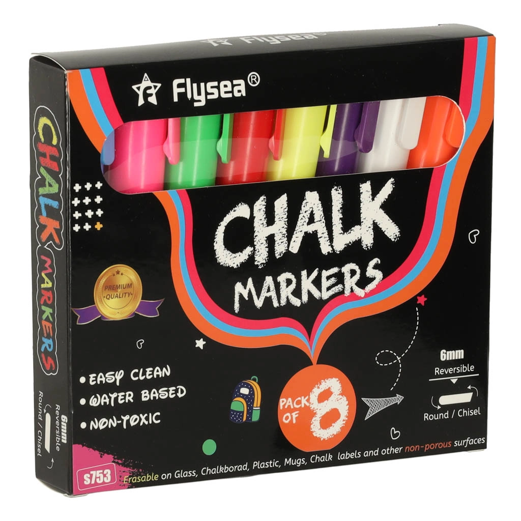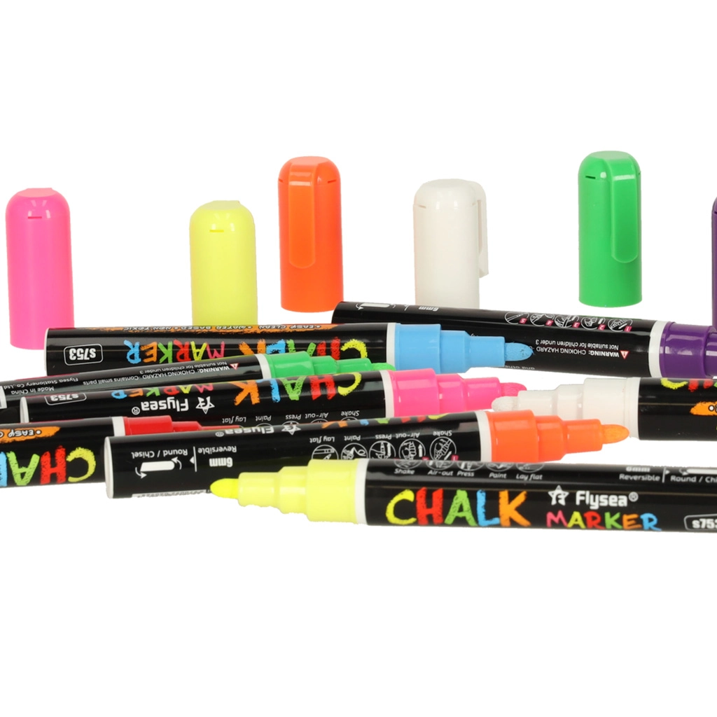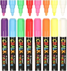 Katrai marķierim ir divpusējs uzgalis (apaļš un slīps), ko var pēc vajadzības pagriezt, nodrošinot līniju precizitāti un daudzveidību. Krīta un ūdens bāzes tinte neatstāj pēdas; pietiek izmantot mitru drāniņu, lai to noņemtu – bez izsmērēšanās un atlikumiem. Turklāt tā nekrāso rokas un nerada putekļus kā tradicionālā krīta.
