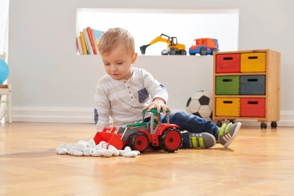 Izturīgs bērnu traktors ar priekšējo kausu mazajiem celtniekiem. Izgatavots no kvalitatīvas plastmasas, ir pilnībā mehāniski funkcionāls, ar izturīgu konstrukciju un atveramu kabīni ar aktīvu figūriņu vēl jautrākām spēlēm mājās un ārā.