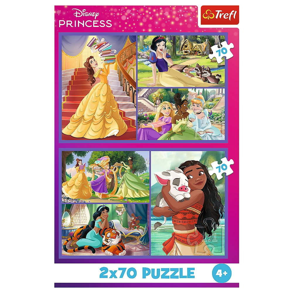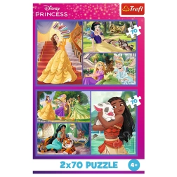 PUZZLE 2x70 Disney princeses Pasaku dienas ir lieliska izvēle visiem bērniem, kuri mīl Disney princeses. Iekļautas divas puzles, kas kopā sniedz dubultu izklaidi.