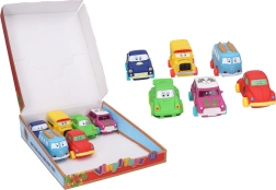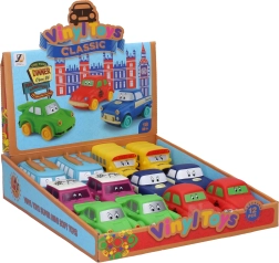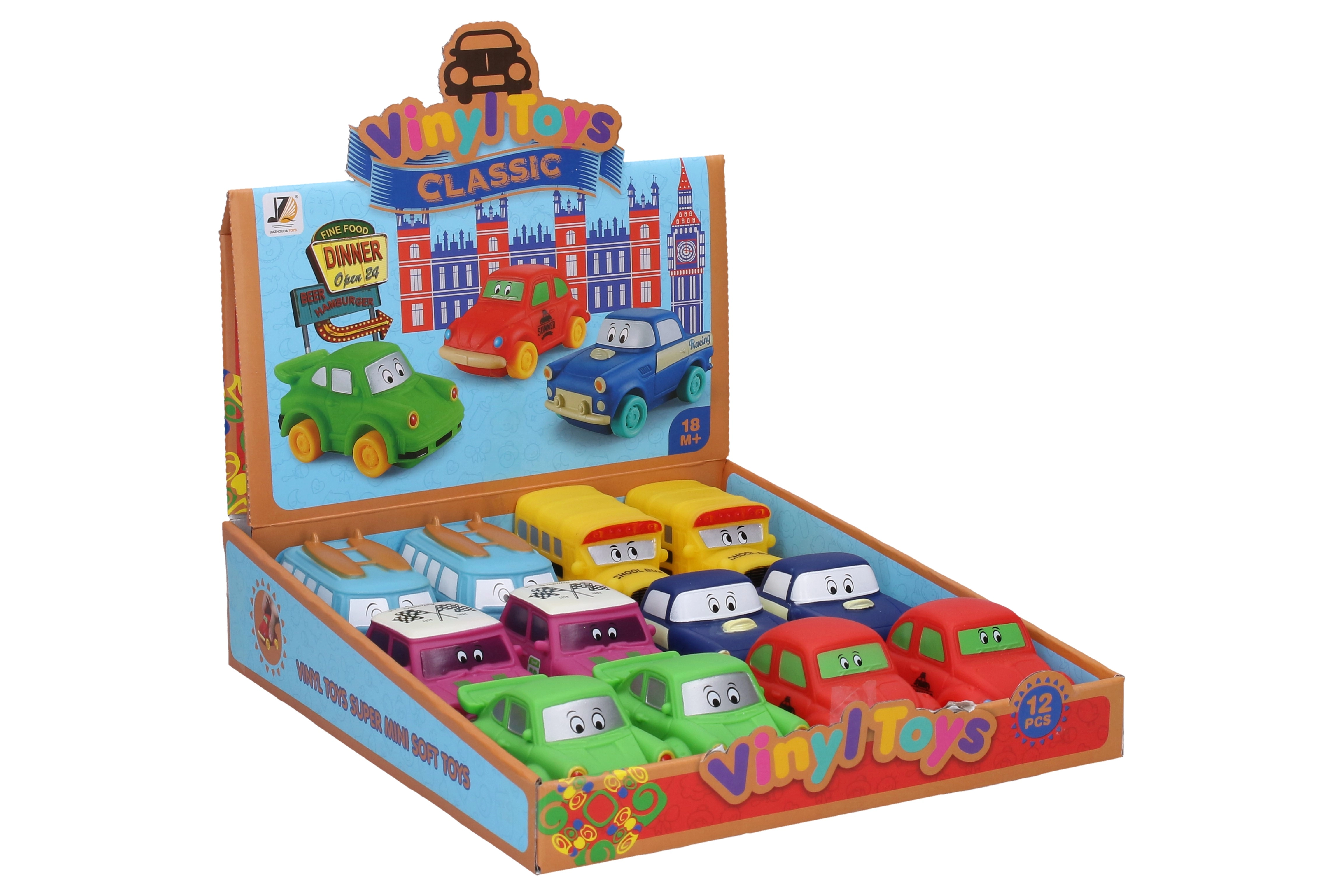 Vieglulīga mašīnīte no mīkstas plastmasas ar garumu 9 cm un brīvi ripojošiem riteņiem. Pieejamas 6 varianti: Vabole, Trabants, sporta auto, Mini, autobuss, furgons.