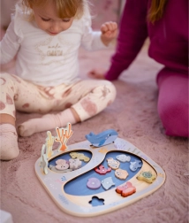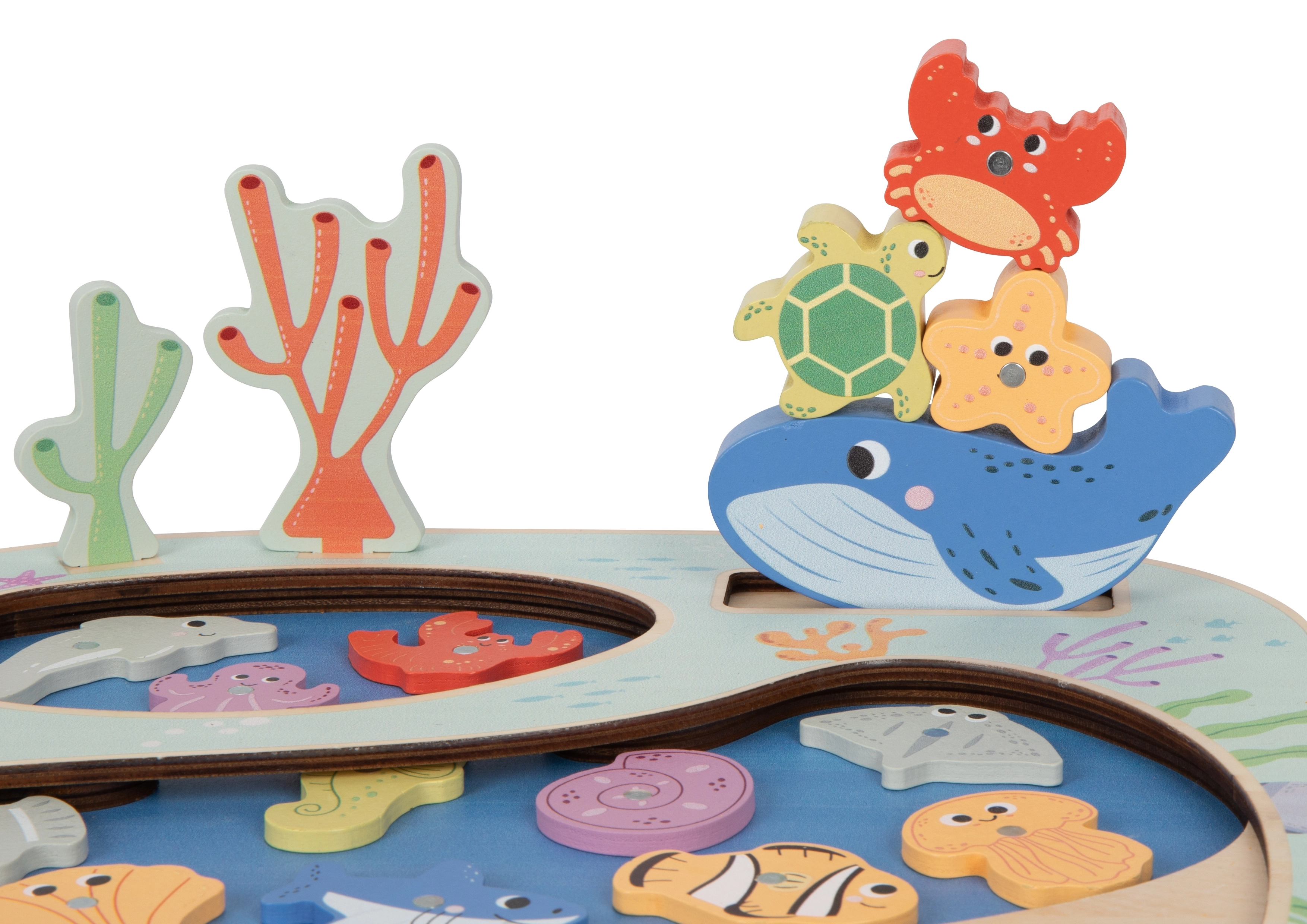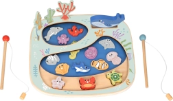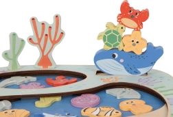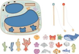 Iekļauti 22 gabali: koka dēlis, jūras dzīvnieciņi un divas magnētiskās makšķeres.