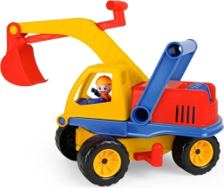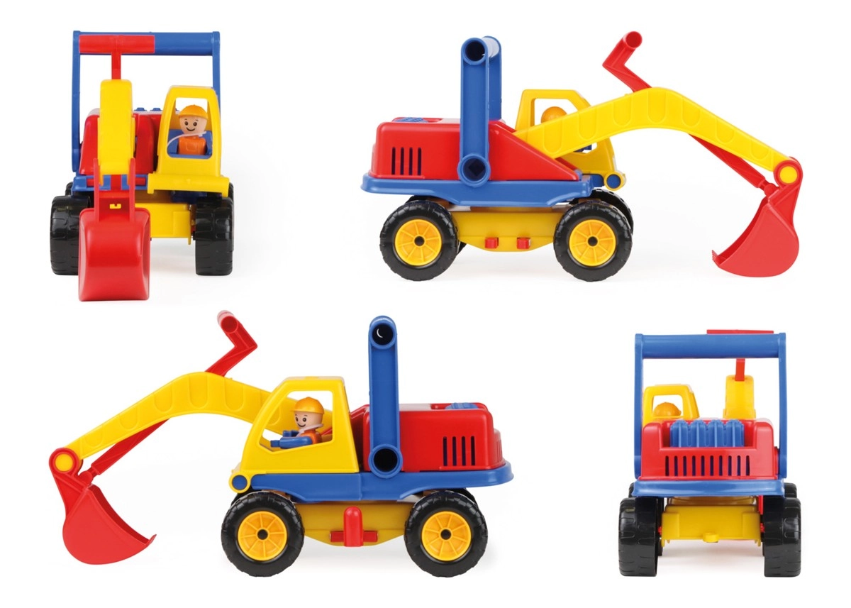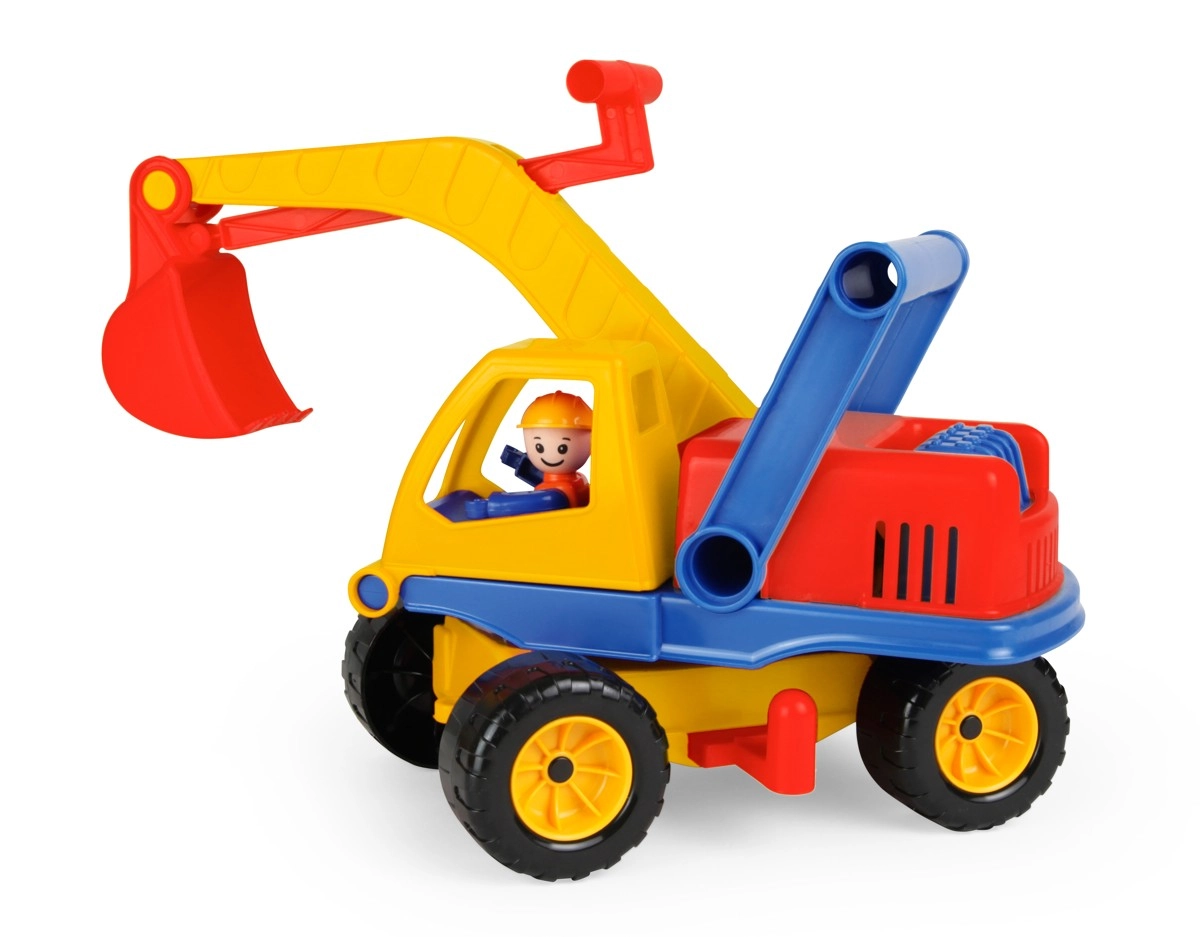 Krāsains bērnu ekskavators 35 cm garumā ar rotējošu augšējo daļu, funkcionālu strēli un vadītāja figūriņu kabīnē. Aprīkots ar 2 asīm, rotācijas bloķēšanu un praktisku rokturi aiz kabīnes ērtai vadībai – ideāli smilšu kastei un spēlēm mājās.