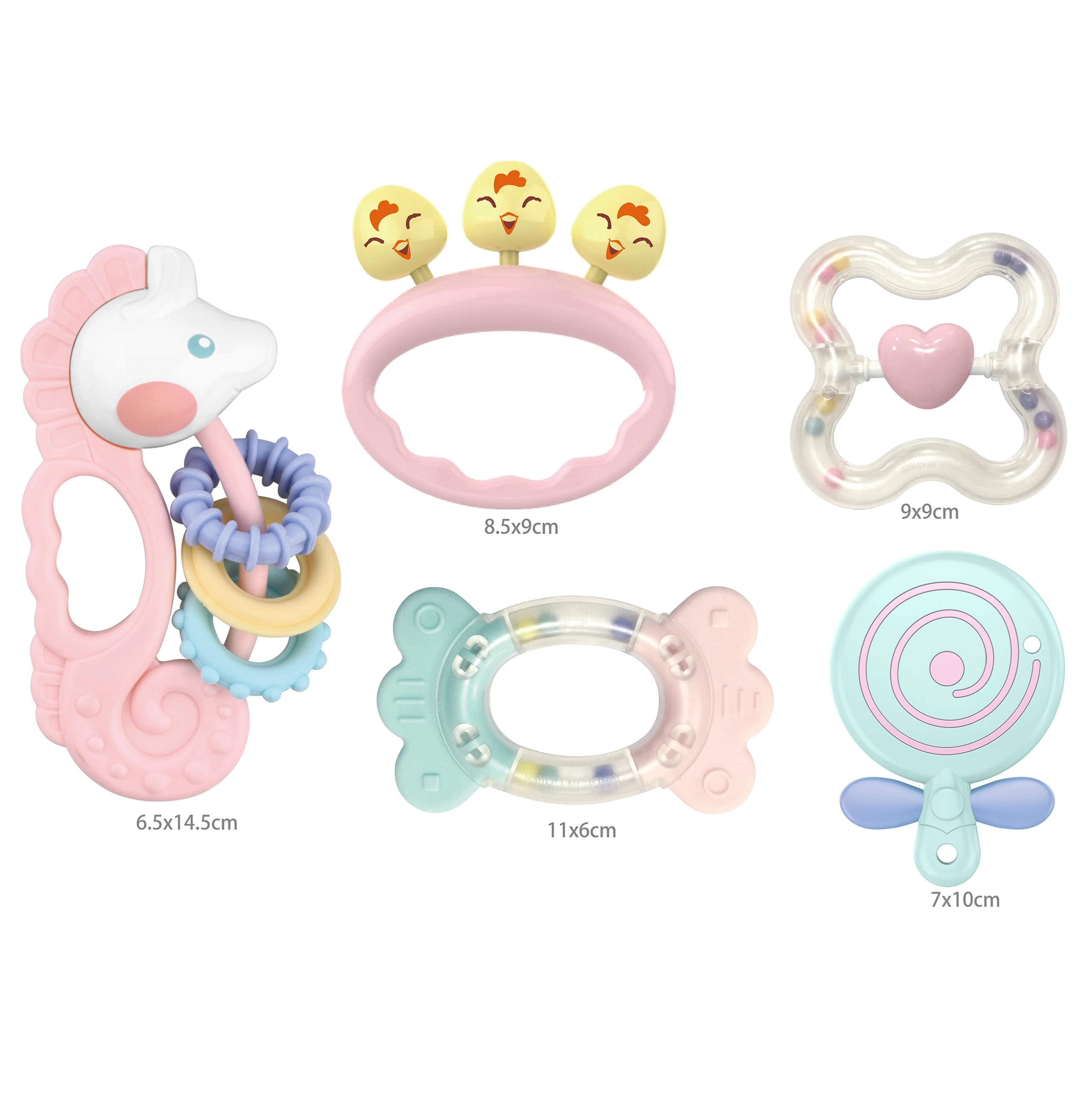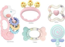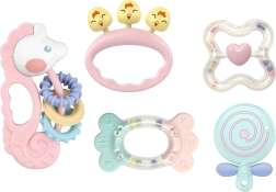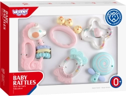 Praktisks 5 krāsainu kociņu un grabuļu komplekts no zīmola WOOPIE sniedz bērniem atvieglojumu zobiņu šķilšanās laikā un vienlaikus veicina sensoro attīstību. Pateicoties dažādajām tekstūrām, izliektām un ieliektām formām un rotaļlietu maigajām skaņām, attīstās redze, dzirde un tauste. Izstrādājumi veidoti no drošiem, netoksiskiem materiāliem – ideāla izvēle ikdienas rotaļām un smaganu nomierināšanai.
