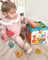 Aktivitāšu kubs ir ideāls bērniem no 18 mēnešiem, un pateicoties izturīgajai plastmasas konstrukcijai tas lieliski iztur ikdienas bērnu izpēti. Skaņu funkcijas (klavieres) piešķir interaktīvu dimensiju un veicina muzikālo gaumi un ritmu. Vienkārši ievietojiet 3× AA baterijas (nav iekļautas komplektā) un izklaide var sākties.