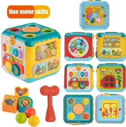 - 6‑v‑1 (klavieres, bumbiņu iedzīšana ar āmuriņu, formu šķirotājs un durtiņas ar slēdzeni, labirints, veramā aukla, pulkstenis ar grabulīti)