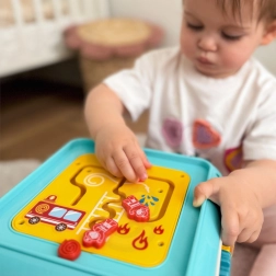 Katra puse sniedz citu izklaidi – klavieres, bumbiņu iedzīšana, šķirotājs, labirints, veramā aukla un pulkstenis ar grabulīti. Ideāli daudzveidīgai spēlei un mācībām.