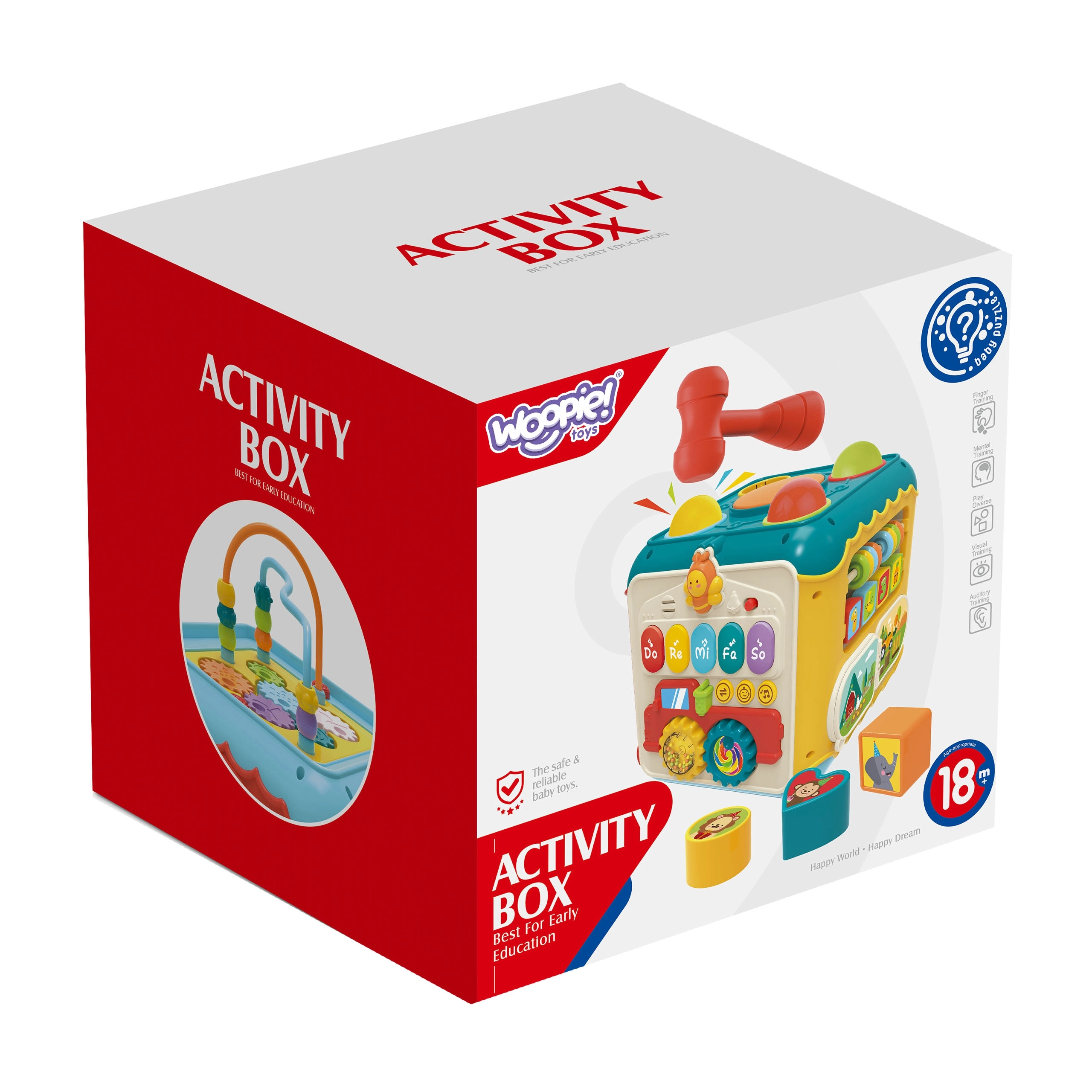 Multifunkcionāls aktivitāšu kubs 6‑v‑1 no zīmola WOOPIE piedāvā mazajiem daudzveidīgas rotaļas un mācīšanos vienlaikus. Katra puse piedāvā citu aktivitāti – klavieres ar skaņām, bumbiņu iedzīšanu ar āmuriņu, labirintu, formas šķirotāju ar durtiņām un slēdzeni, veramo auklu un pulksteni ar grabulīti. Rotaļlieta attīsta sīko motoriku, acu‑roku koordināciju, krāsu, formu un skaņu atpazīšanu un veicina ziņkāri un radošumu. Kompaktie izmēri nodrošina ērtu pārnēsāšanu un nebeidzamu izklaidi ceļā un mājās.