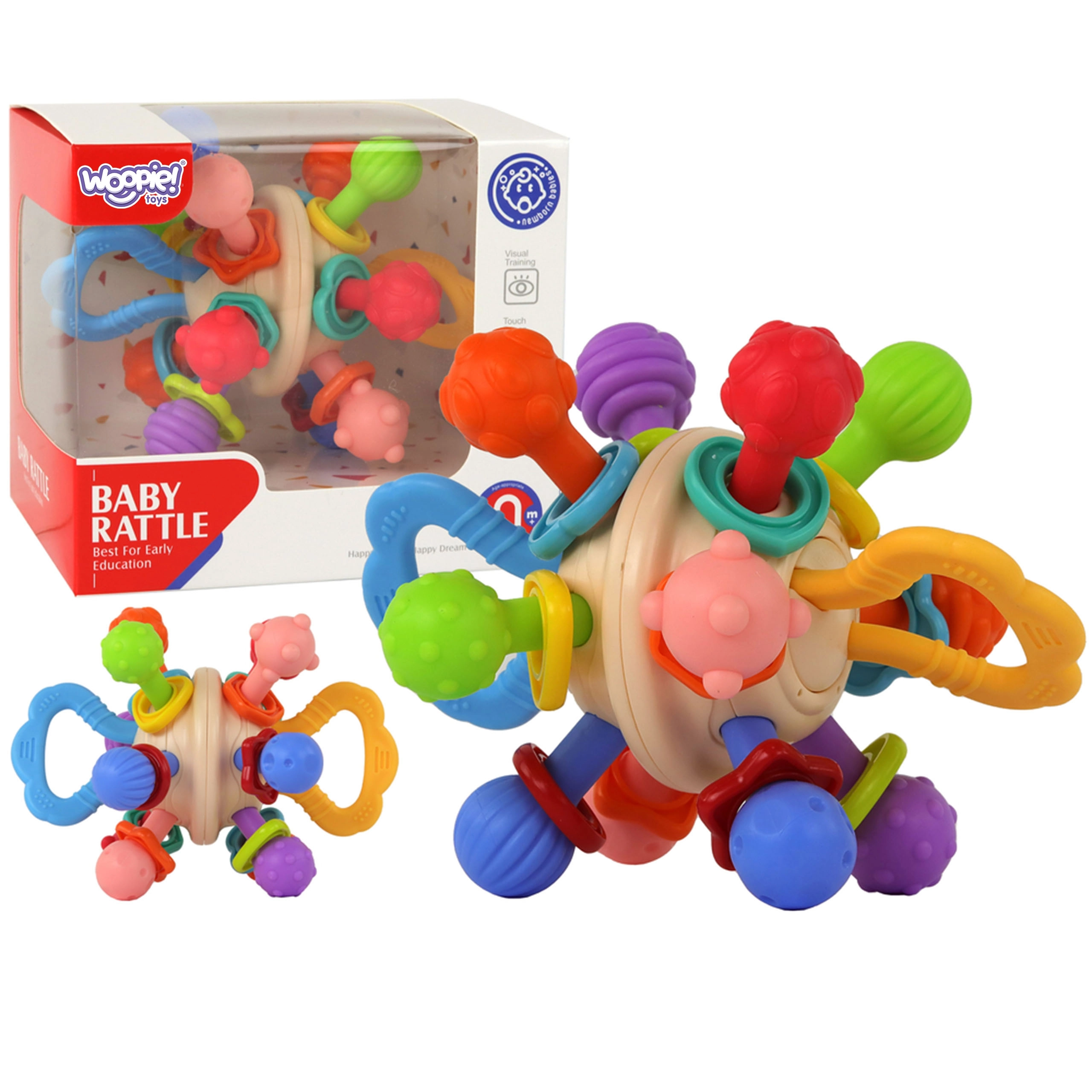 Krāsainā rumba bumba no WOOPIE ir izstrādāta, lai piesaistītu bērnu uzmanību un atbalstītu viņu attīstību ar dažādām tekstūrām un skaņas efektiem. Rotaļlieta ir ideāli piemērota bērniem no dzimšanas, apvienojot graužamriņķa un grabulīša funkcijas vienā. Tās konstrukcija ir ērta mazām rociņām un droša, pateicoties asu malu neesamībai.