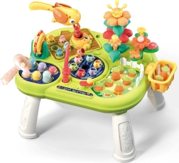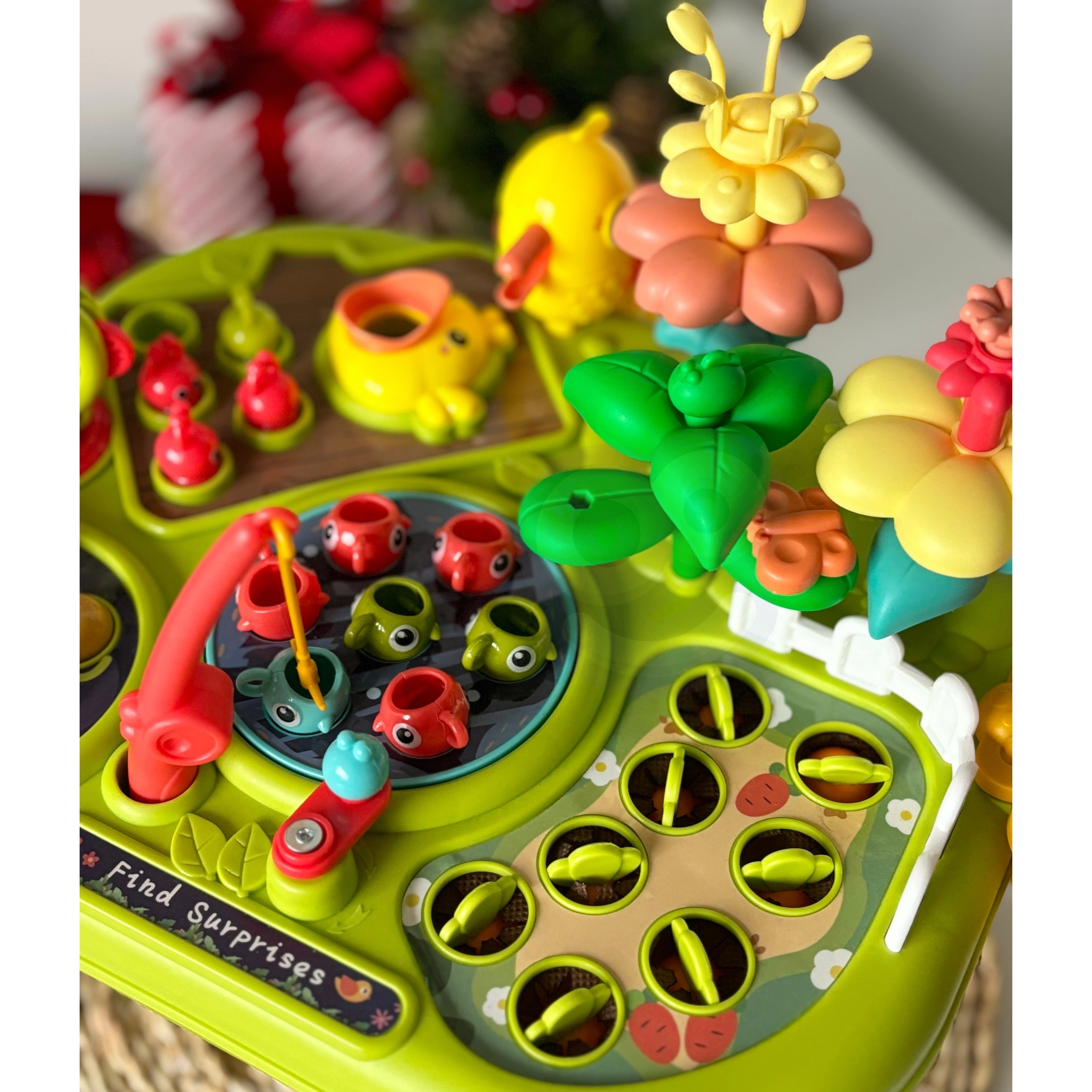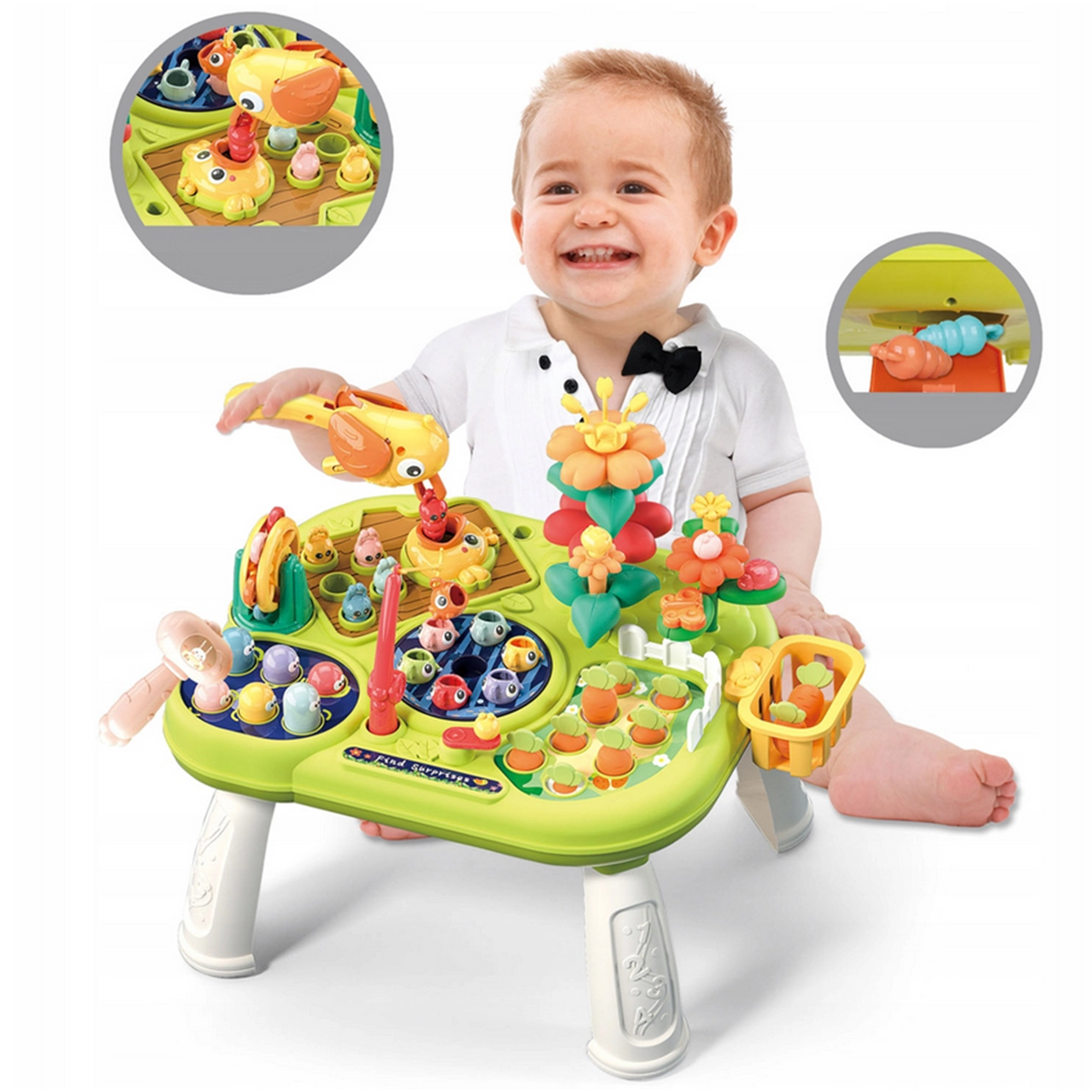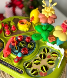 Kas bērnus sagaida? Zivtiņu ķeršana ar makšķeri, tārpiņu dauzīšana ar āmuriņu, ziedu šķirošana un likšana, burkānu novākšana, barošana putnēnam, rotējošs dzirnavrats, praktisks groziņš detaļām un slēptuve tārpiņiem. Katras aktivitātes laikā attīstās citas prasmes un tiek noturēta bērna uzmanība bez liekiem traucēkļiem.