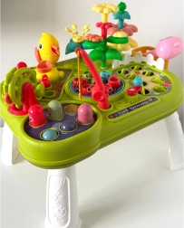 - 8 in 1 (zivtiņu ķeršana, tārpiņu dauzīšana, ziedu likšana, burkānu izvilkšana, putnēna barošana, rotējošs dzirnavrats, groziņš detaļām, tārpiņu slēptuve)