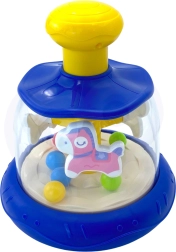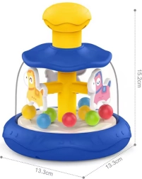 Nospiežot karuseļa augšējo daļu, zirgs un bumbiņas sāk kustēties, nodrošinot aizraujošu vizuālu un taustes stimulu.