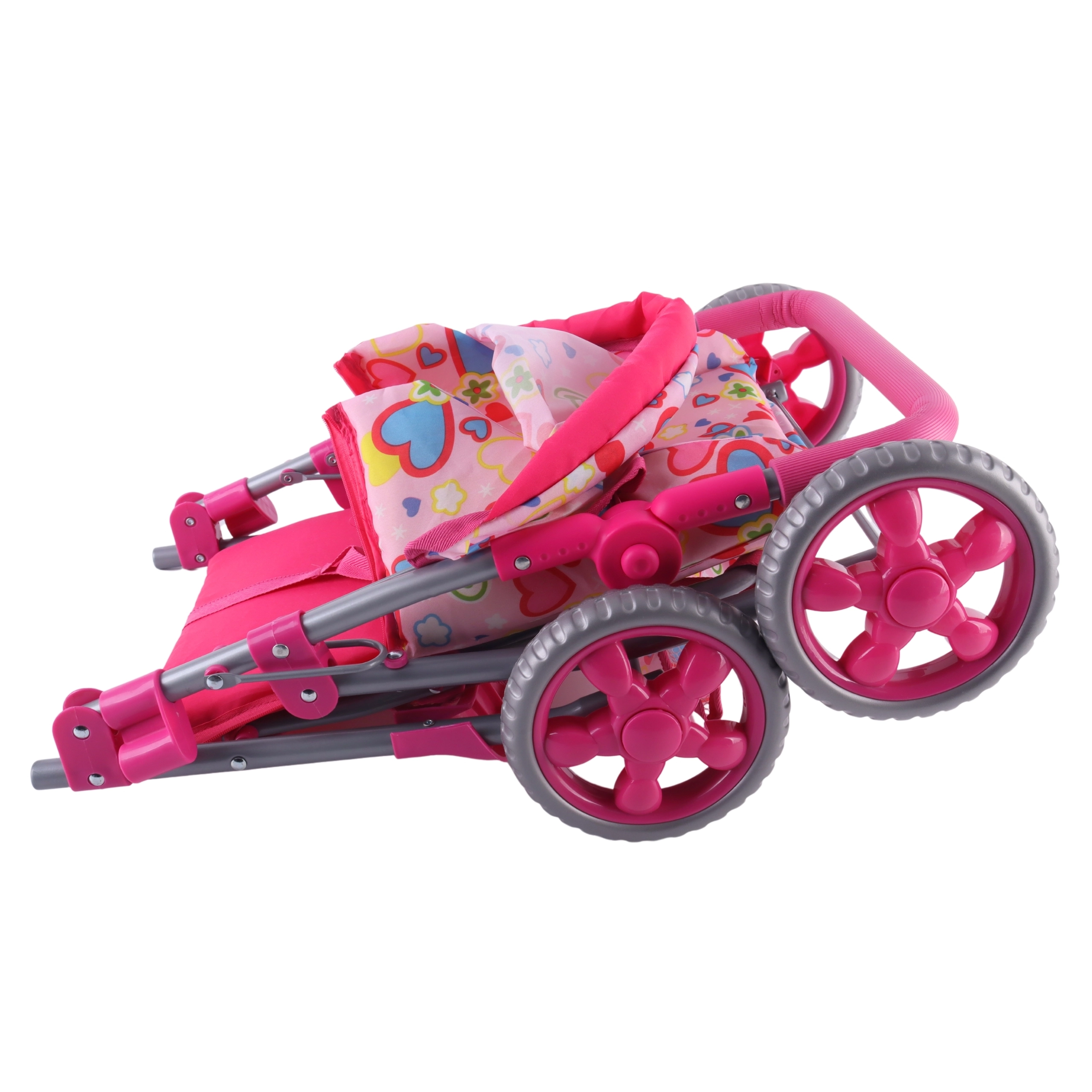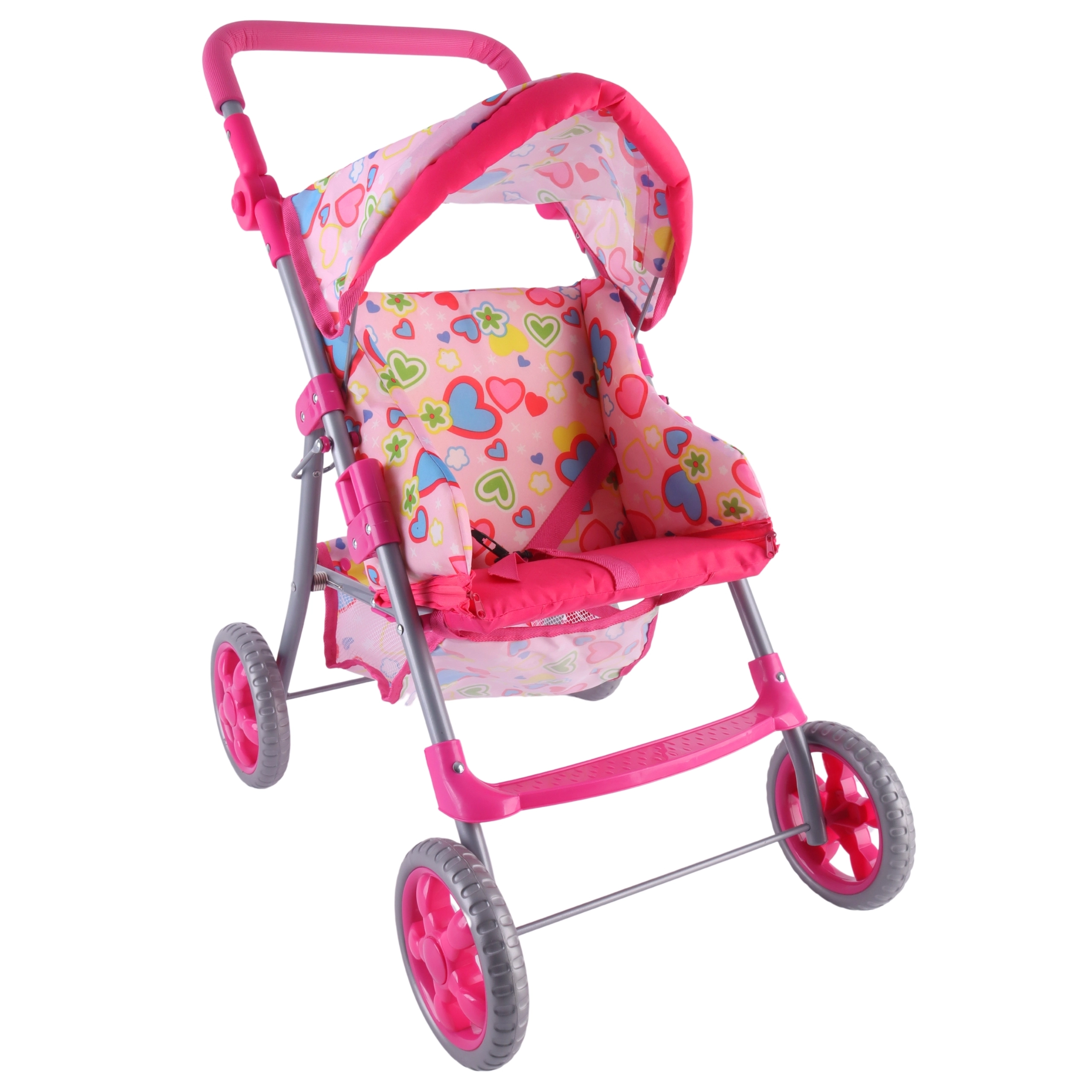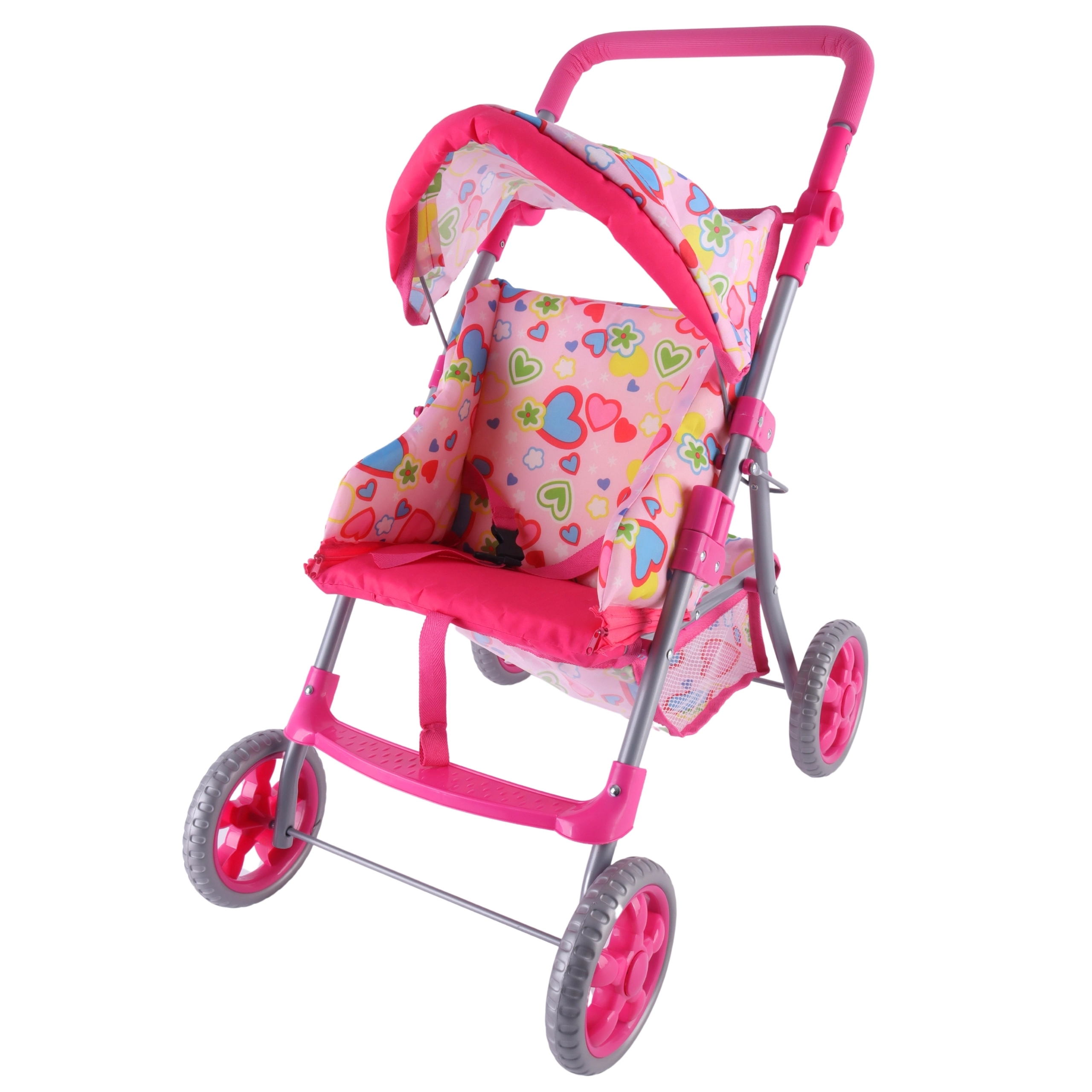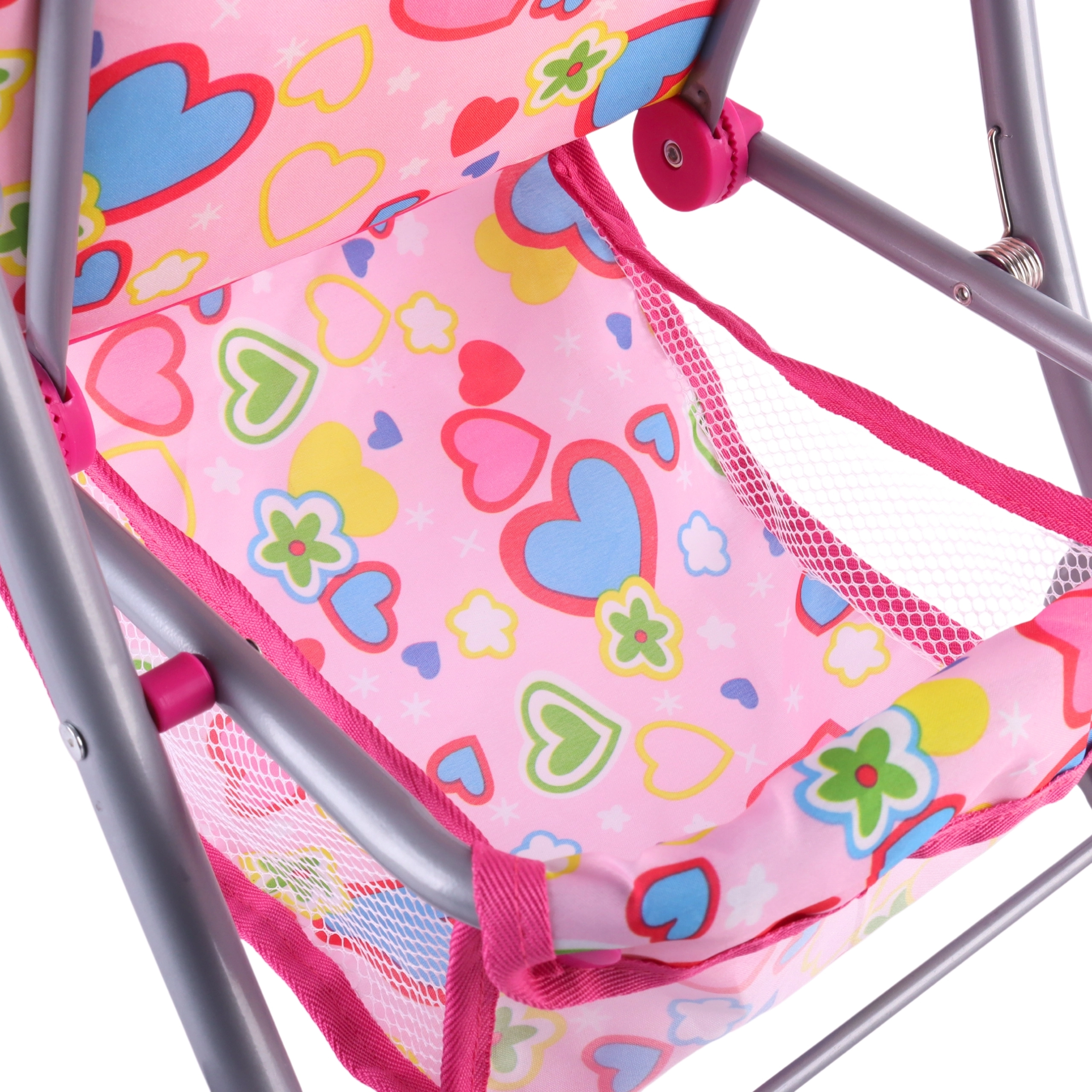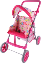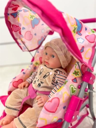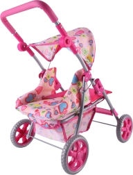 Nojume pasargā lelli no saules, bet apakšējais grozs ietilpina visas bērna mantas.