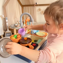 Krāns ar īstu ūdens cirkulāciju ļauj bērniem interaktīvi mācīties un rotaļāties kā īstā virtuvē.