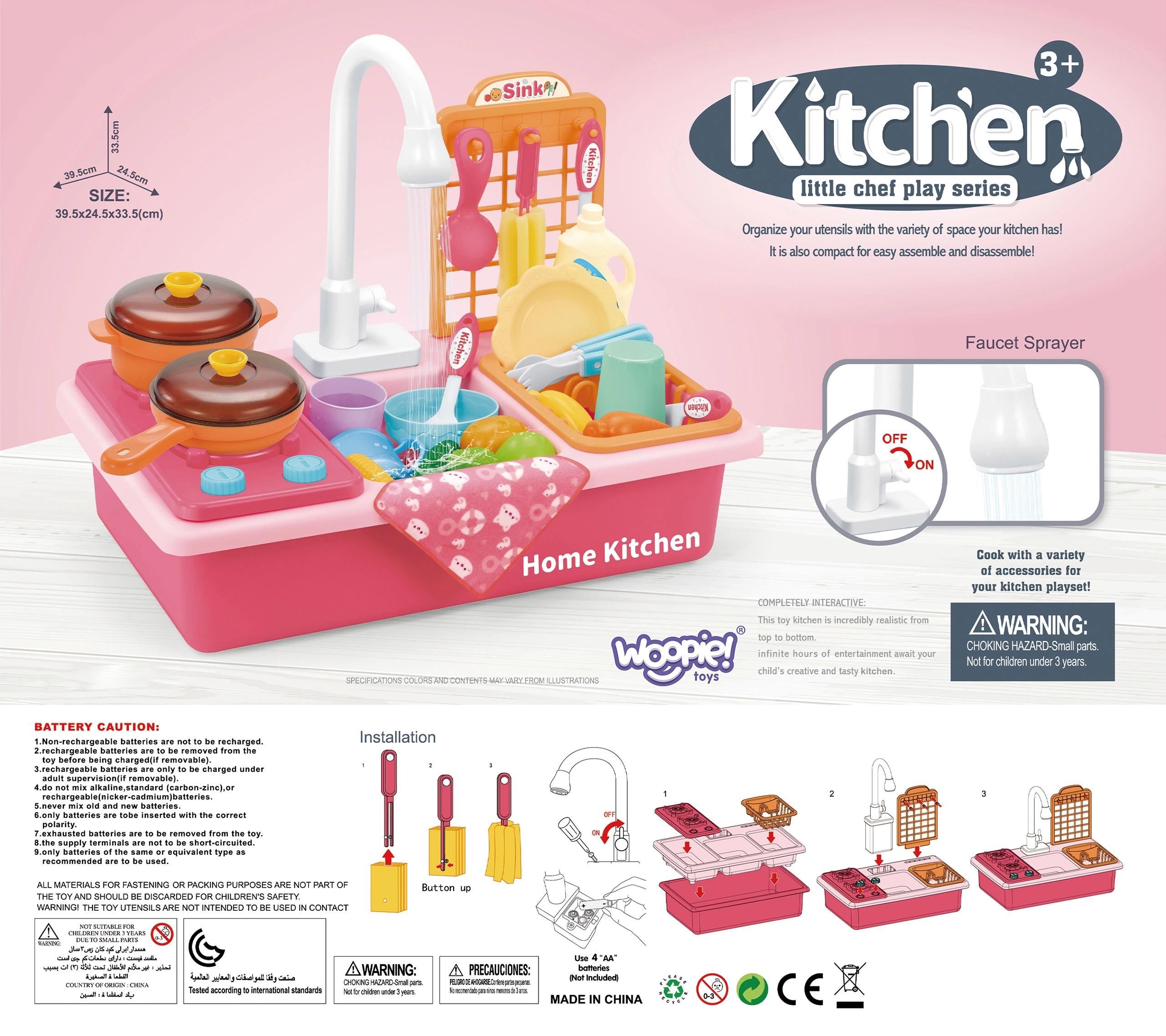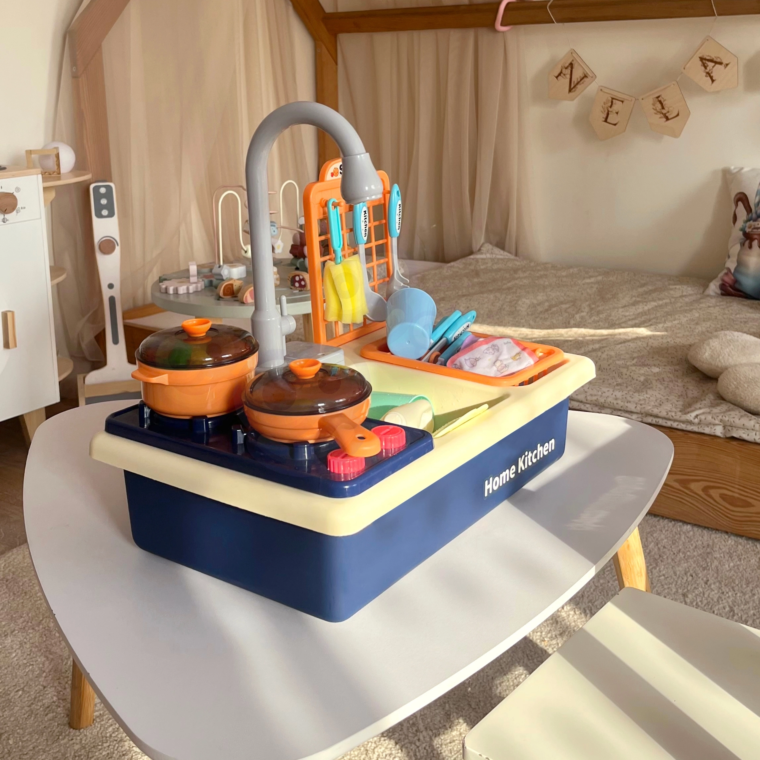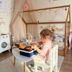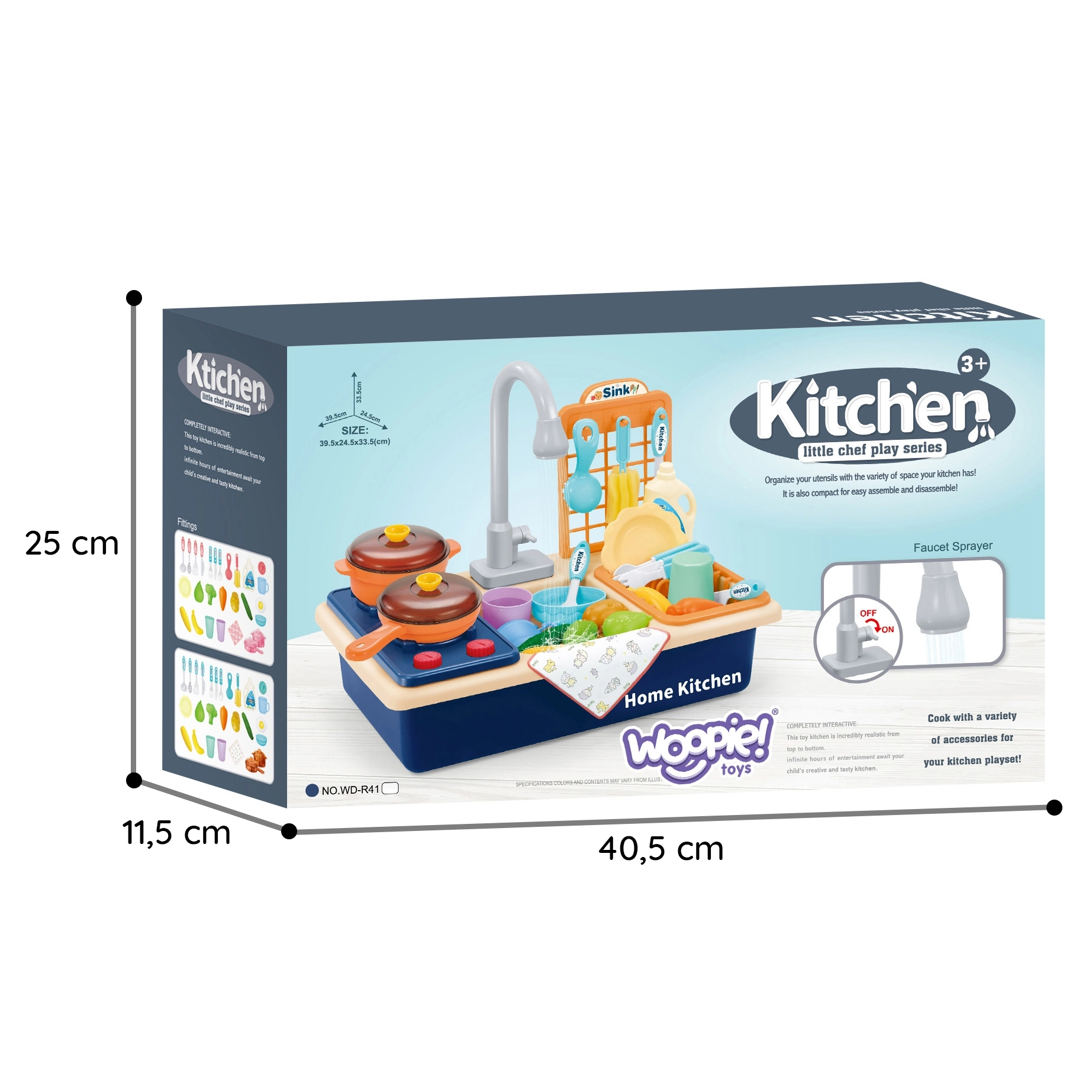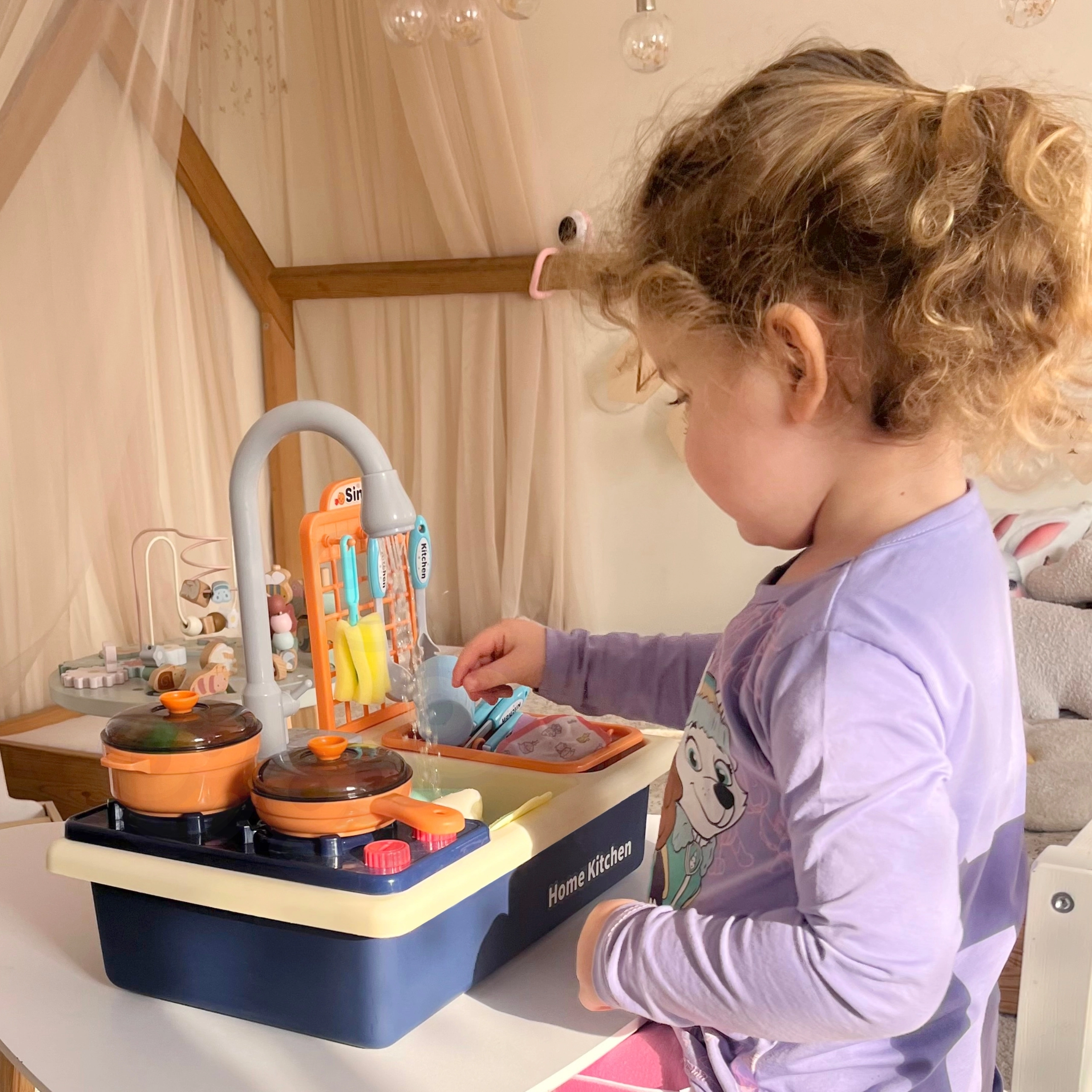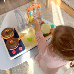 Rotaļu virtuve ar izlietni 2‑vienā no zīmola WOOPIE ļauj bērniem gatavot un mazgāt traukus kā vecākiem. Reālistiskās funkcijas un kustīgie elementi, piemēram, grozāmi jaucējkrāna kloķi un darbojošs krāns ar īstu ūdeni, nodrošina stundām ilgu izklaidi un mācīšanos.