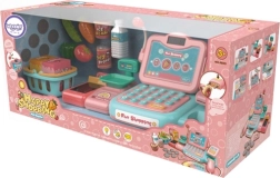 Bērnu kase WOOPIE ir ideāla mazajiem pārdevējiem no 3 gadu vecuma. Komplektā iekļauti 24 piederumi, tostarp groziņš, augļi un dārzeņi, dzērieni, saldējums, rotaļu nauda un maksājumu karte. Realistiski elementi, piemēram, lasītājs, svari, mikrofons un maksājumu terminālis, rada autentisku iepirkšanās pieredzi.
