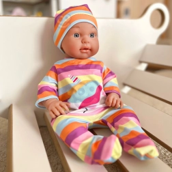 Stilīgs apģērbu komplekts ar vienradža motīvu pārvērtīs jebkuru lelli par mīlīgu bēbīti, gatavu rotaļām un mīļošanās brīžiem. Krāsainās svītras un saskaņotā cepurīte piesaista skatienu jau no pirmā brīža, savukārt ērtā piegrieztne atvieglo pārģērbšanu pat mazākiem bērniem. Lieliska dāvana – iepakojumam ir praktiska cilpa ērtai pārvadāšanai.
