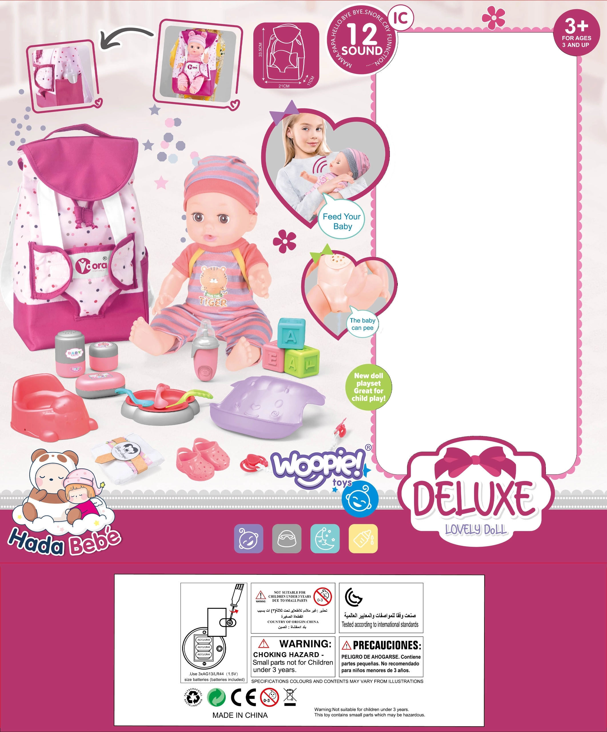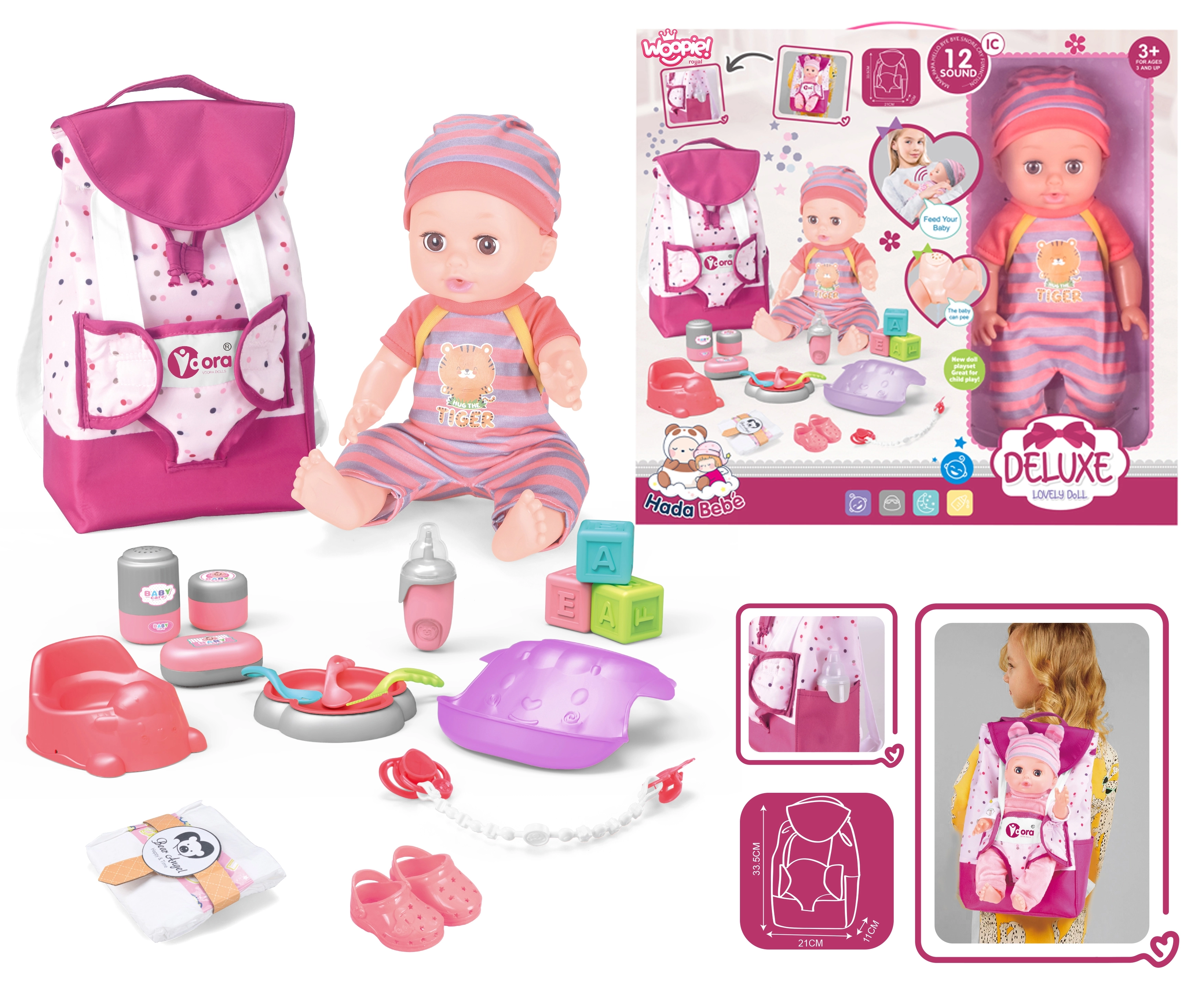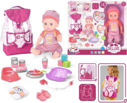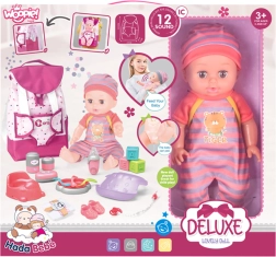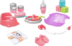 Komplektā ir visi nepieciešamie piederumi lelles aprūpei. Bērni atradīs barošanas komplektu, pārtīšanas piederumus un daudzas citas rotaļlietas. Lelle pat prot čurāt podiņā, kas piešķir spēlei lielāku reālisma sajūtu.