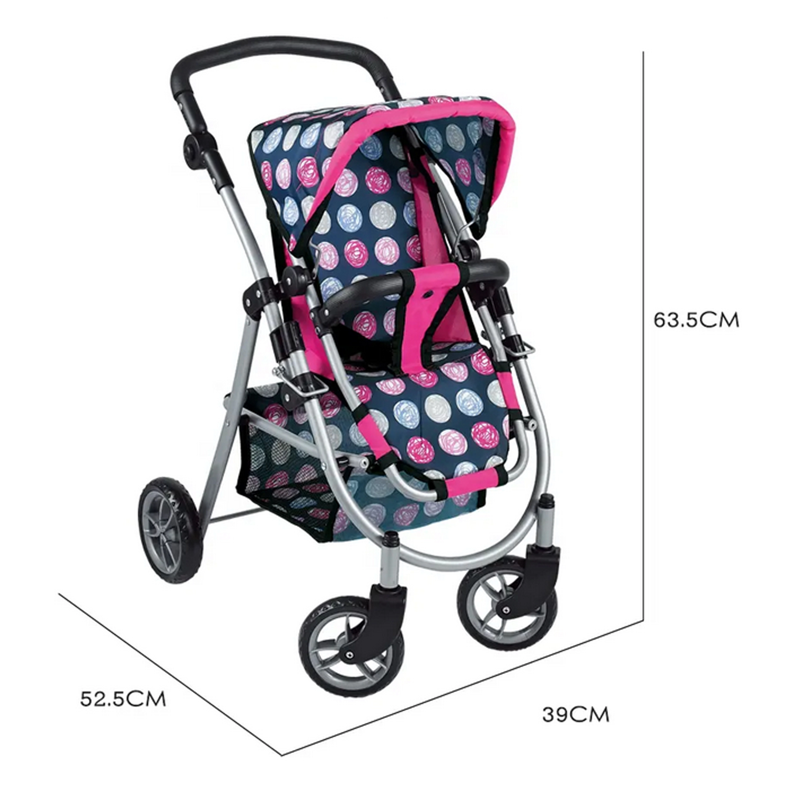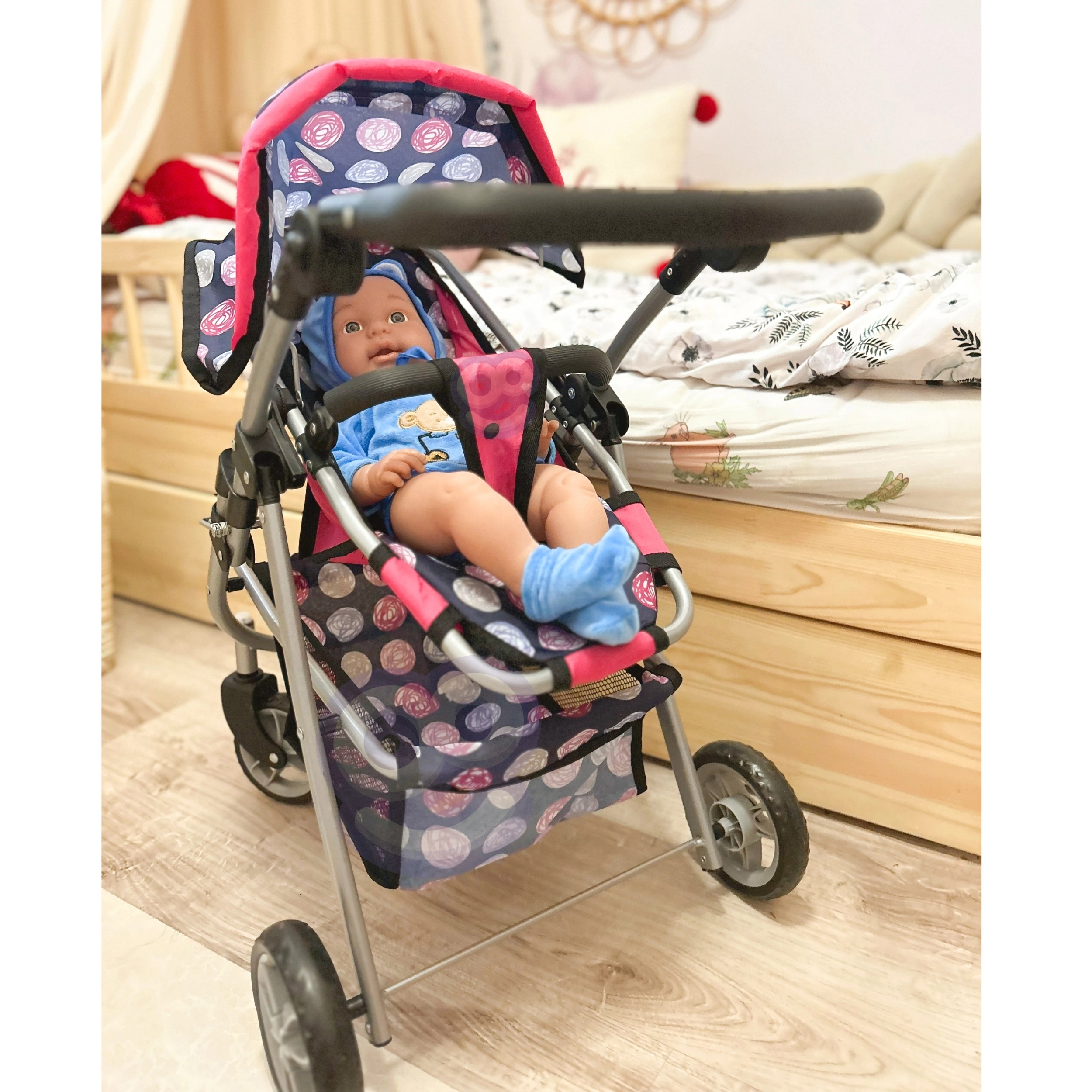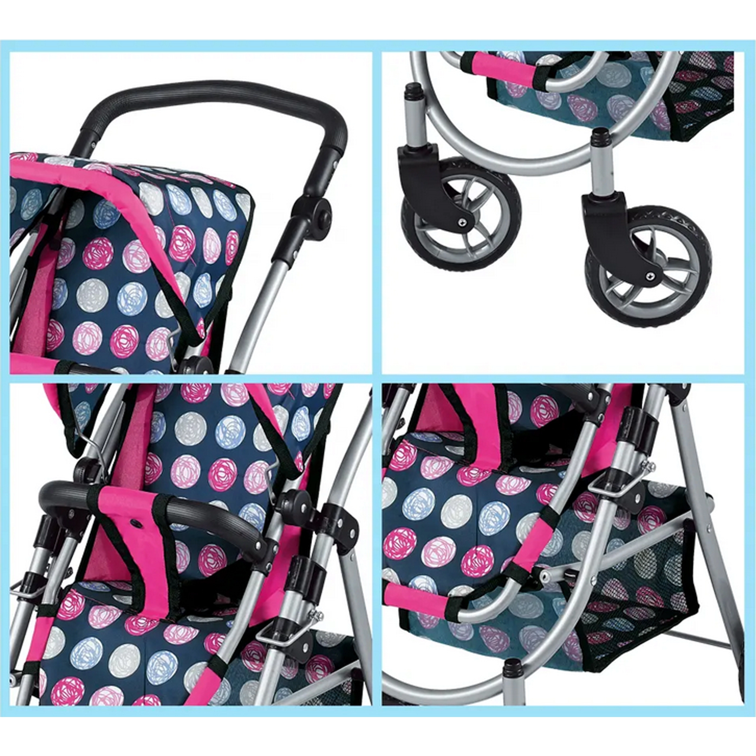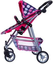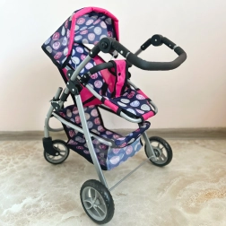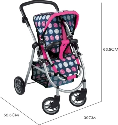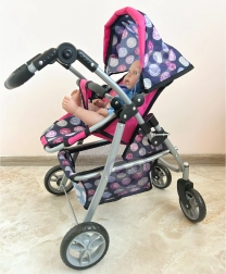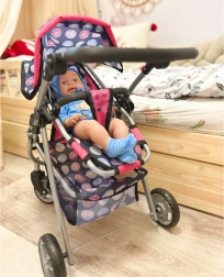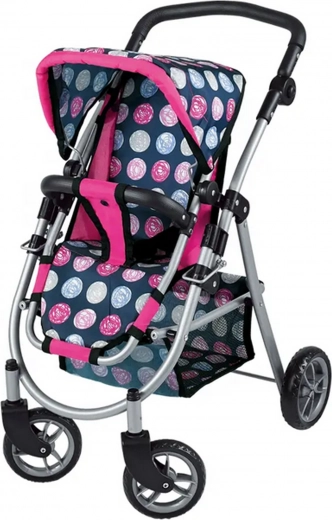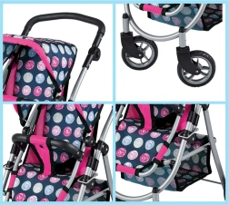 Vieglā, bet stabilā metāla konstrukcija ar mīgu rokturi ir saudzīga bērnu rokām. Ietilpīgais tekstila grozs zem sēdeklīša ietilpinās visas nepieciešamās lietas – pudelīti, sedziņu un sīkus aksesuārus. Saliekamā jumtiņa pasargā lelli “saulītē”, un ratus ir viegli novietot glabāšanā.